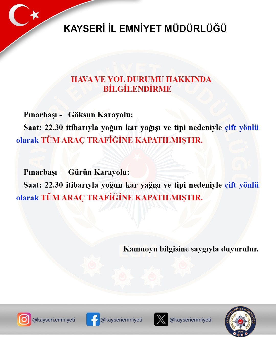 Kayseri- Kahramanmaraş yolu saat 22.30 itibariyle yoğun kar yağışı ve tipi nedeniyle araç trafiğine kapatıldı. Kayseri İl Emniyet Müdürlüğü’nden yapılan açıklamada, “Pınarbaşı-Göksün kara yolu: Saat 22.30 itibariyle yoğun kar yağışı ve tipi nedeniyle çift yönlü olarak tüm araç trafiğine kapatılmıştır. Pınarbaşı- Göksün kara yolu: Saat 22.30 itibariyle yoğun kar yağışı ve tipi nedeniyle çift yönlü olarak tüm araç trafiğine kapatılmıştır” ifadelerine yer verildi.