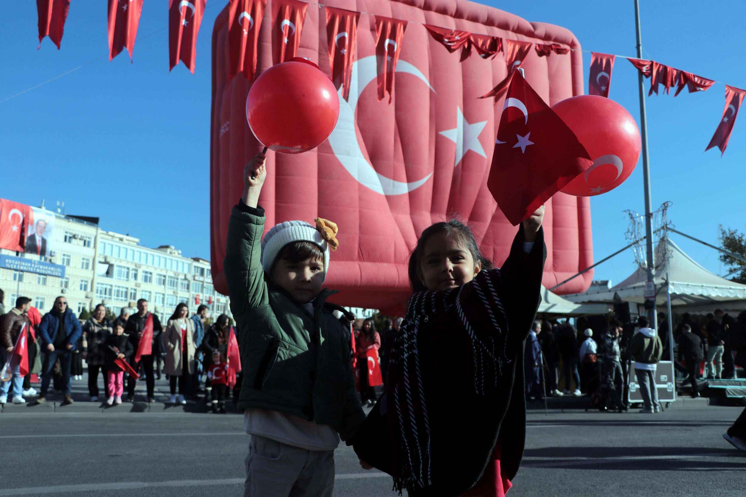 • Türkiye Cumhuriyeti’nin 101’inci kuruluş yıl dönümü nedeniyle düzenlenen kutlamalarda, Cumhuriyet Meydanı'nda şişirilen Türk bayraklı sıcak hava balonu, vatandaşlar tarafından ilgiyle karşılandı. Fotoğraf: Furkan KAVUKLU/Kayseri, (DHA)