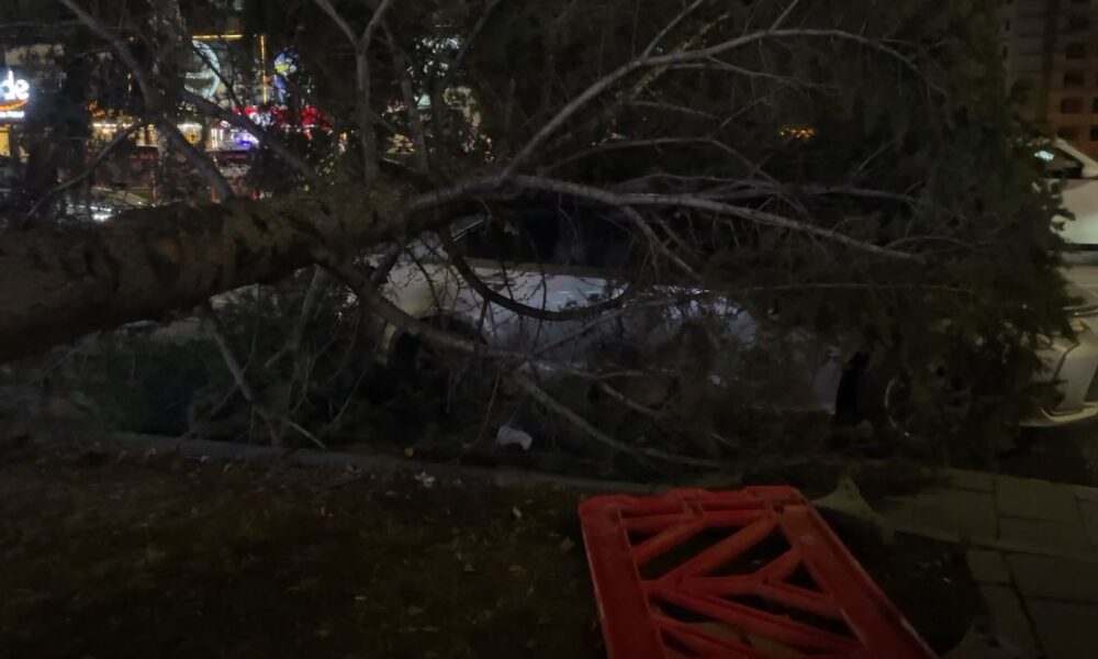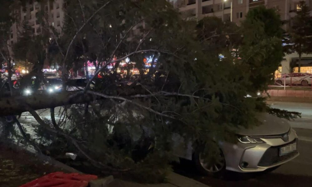 Kayseri’de kuvvetli fırtınada otomobilin üzerine ağaç devrildi