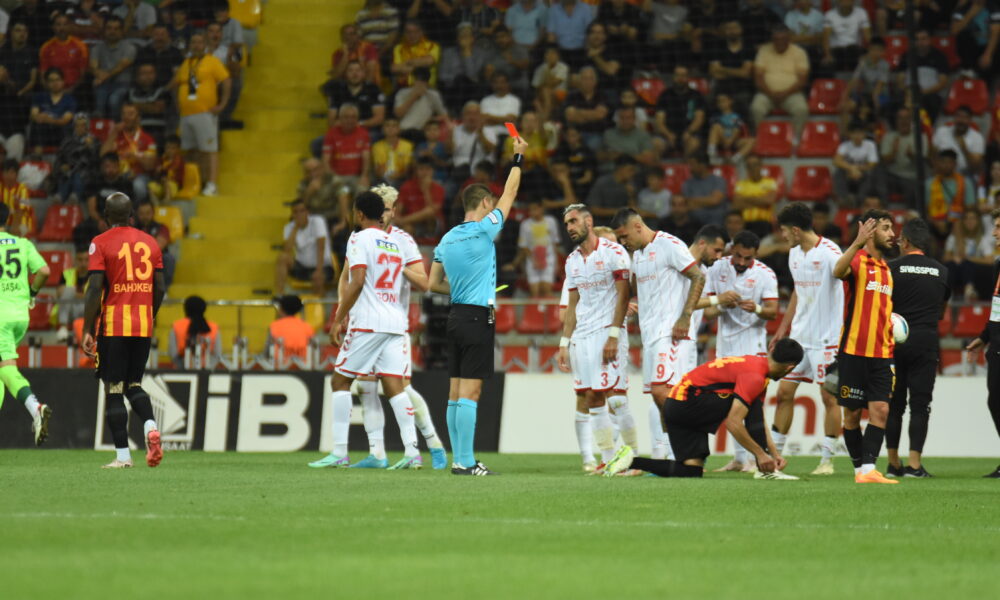 Sivasspor, sezonun 2'nci haftasında konuk olduğu Kayserispor karşısında 1-0 geriden gelerek 2-1 öne geçti. Konuk takımdan Uğur Çifçi ikinci sarı karttan kırmızı kart gördü. Fotoğraf: İlyas Kaplan/Kayseri(DHA)