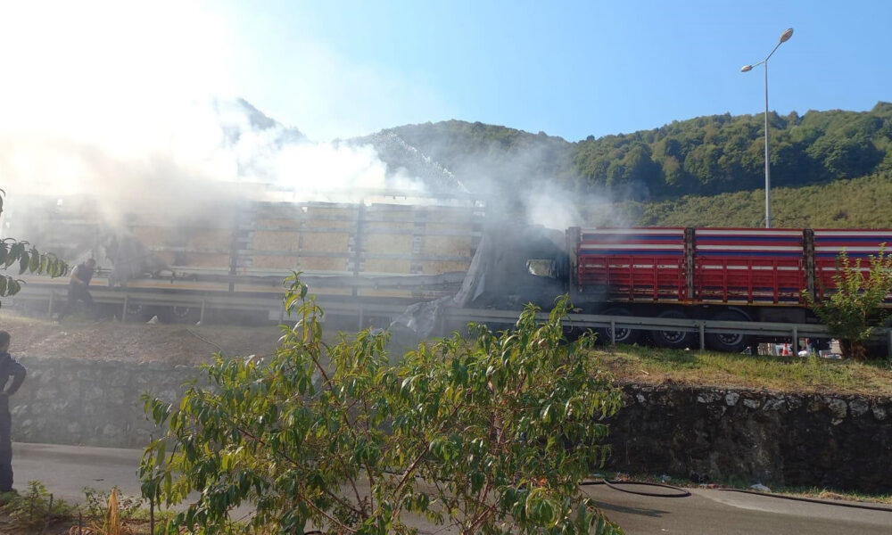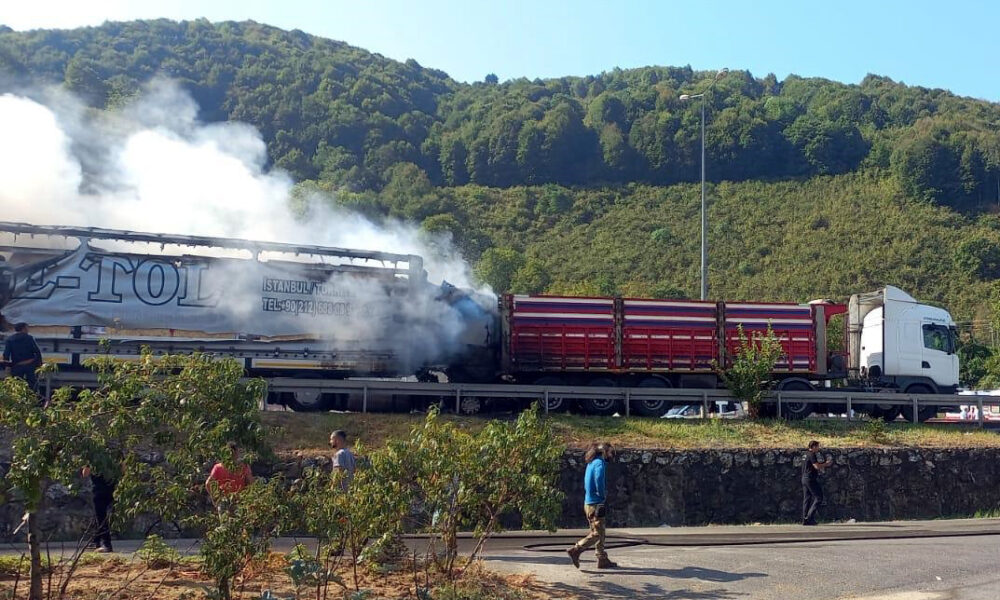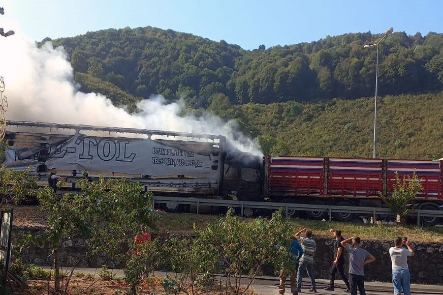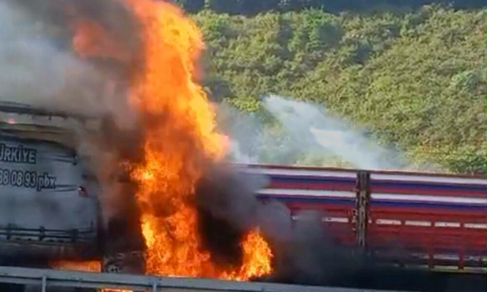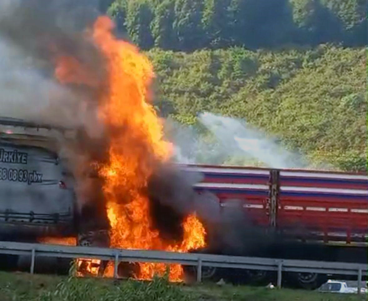 Düzce'nin Kaynaşlı ilçesinde LPG deposu yüklü TIR, başka bir TIR'a arkadan çarptıktan sonra alev alev yandı. Fotoğraf: Düzce,(DHA)
