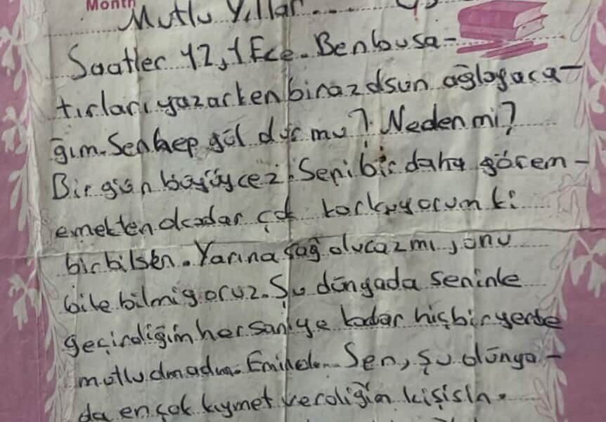 “Saatler 12.01 Ece. Ben bu satırları yazarken biraz olsun ağlayacağım. Sen hep gül olur mu? Bir gün büyüyeceğiz. Seni bir daha görememekten o kadar çok korkuyorum ki bir bilsen. Yarına sağ olacak mıyız onu bile bilmiyoruz. Belki beni unutursun ama ben seni kalbimde taşıyacağım.”