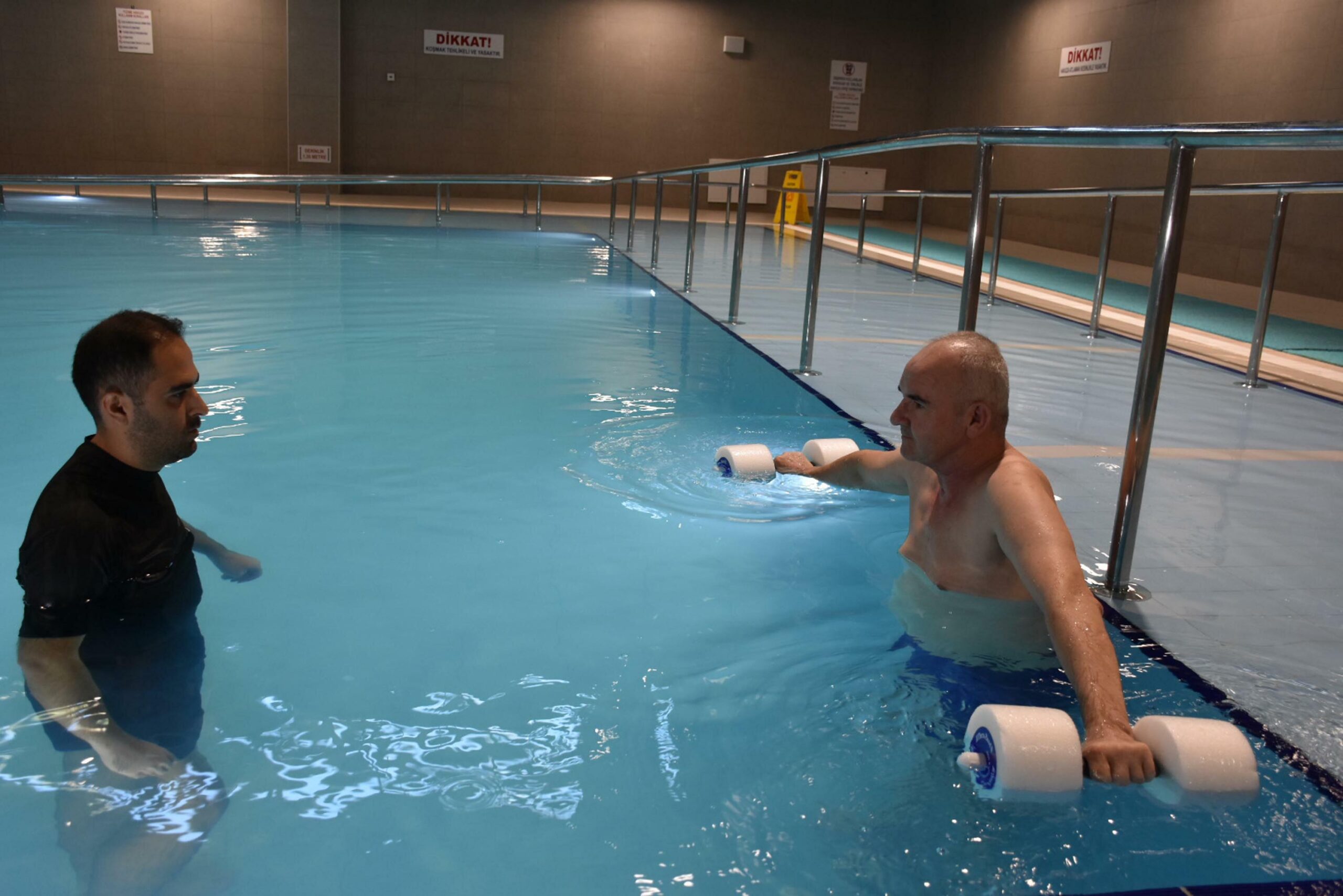 Desteksiz yürümeye başlayan Geçerin tedavisini yapan Fiziksel Tıp ve Rehabilitasyon Kliniği İdari Sorumlu Hekimi Doç. Dr. Buğra İnce, “Zekeriya bey, trafik kazası sonrası boyun omurlarında kırık ve kaymaya bağlı omurilik hasarı ve buna bağlı olarak alt uzuvlarında belirgin olarak kaslarda güçsüzlük şikayetiyle geldi. Desteksiz ayakta duramıyordu. Kapsamlı bir rehabilitasyon süreci başladı. Havuz tedavisi uyguladık. Su, daha toleranslı ve güvenli bir tedavi yöntemi. Bu tedavide suyun direncinden de faydalanıyoruz. Zayıf kasların güçlendirmesinde bizim için avantajlı bir ortam sağlamakta. Sınırlı sayıda merkez havuz tedavi uyguluyor. İzmirde kamu hastanelerinde havuz tedavisi sadece şehir hastanesinde var. Havuz tedavisi Zekeriya beye uyguladığımız tek tedavi değil. Kendisine kapsamlı bir tedavi uyguladık. Geleneksel fizik tedavi uygulamaları da yaptık. Görsel destekli analiz ve özel denge cihazımızla bu tedavileri aldı. Artık herhangi bir alete veya cihaza ihtiyaç duymadan yürüyebiliyor. Bizler modern tıbbın tüm imkanlarını kullanarak hastalarımızın rehabilitasyonu gerçekleştiriyoruz. Referans bir merkez olarak hizmet vermekteyiz. Hastalarımız fiziksel ve psikolojik olarak toparlayacaklarına inanıp, kendilerini bizlere emanet edebilirler” dedi.