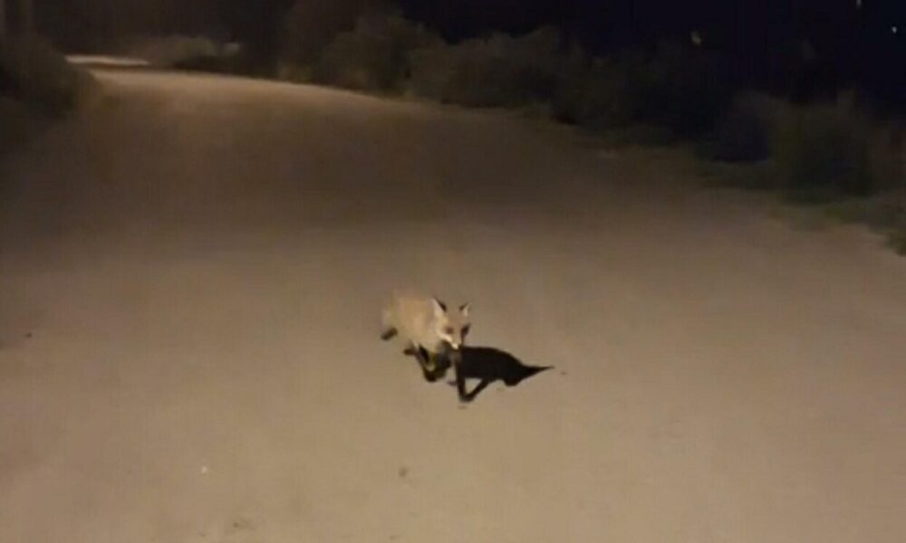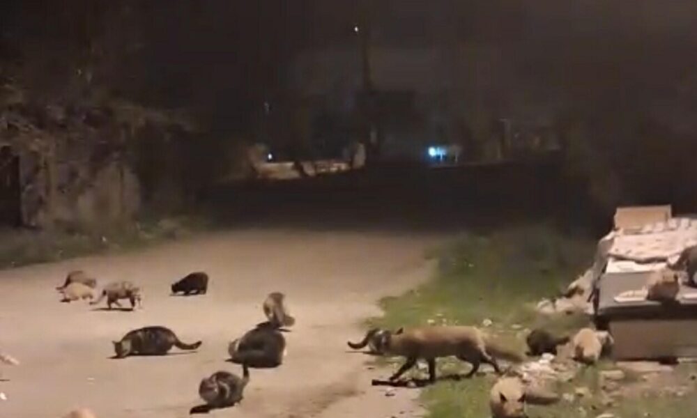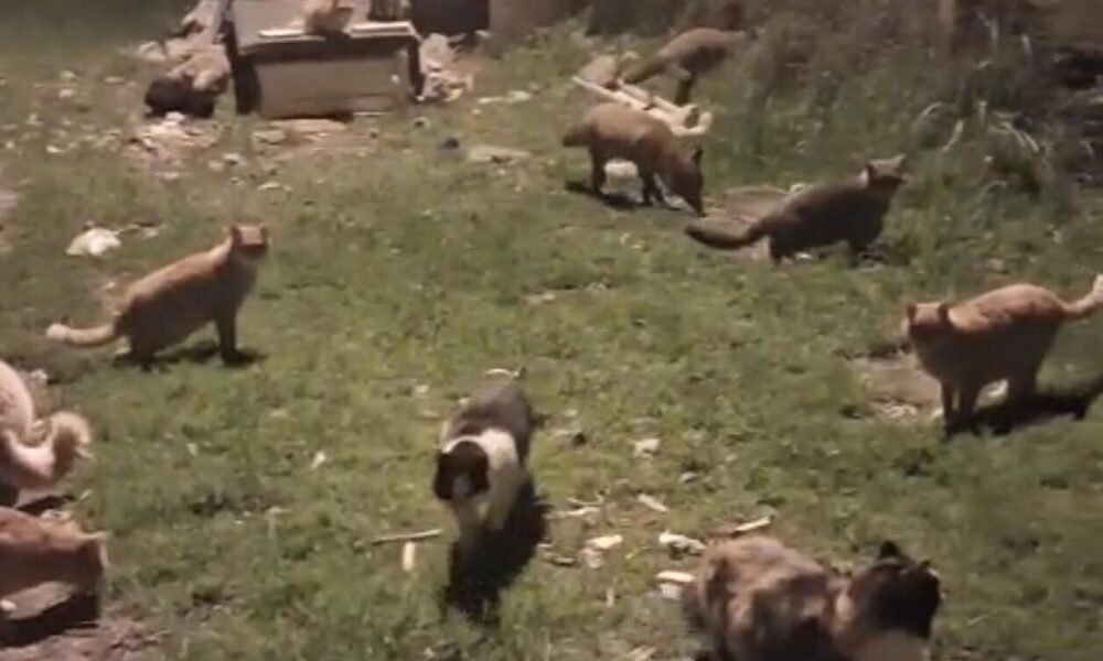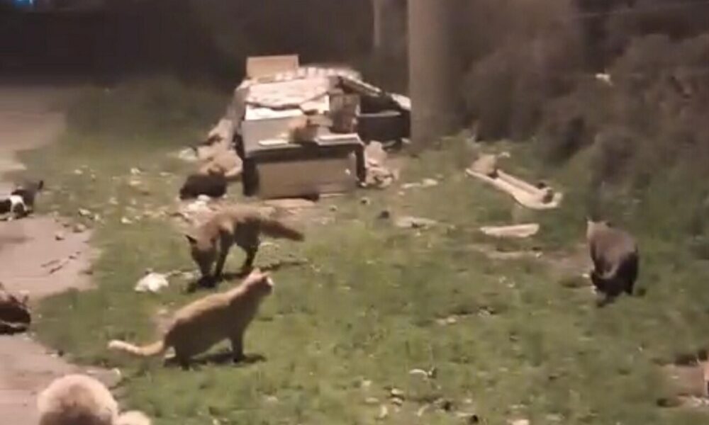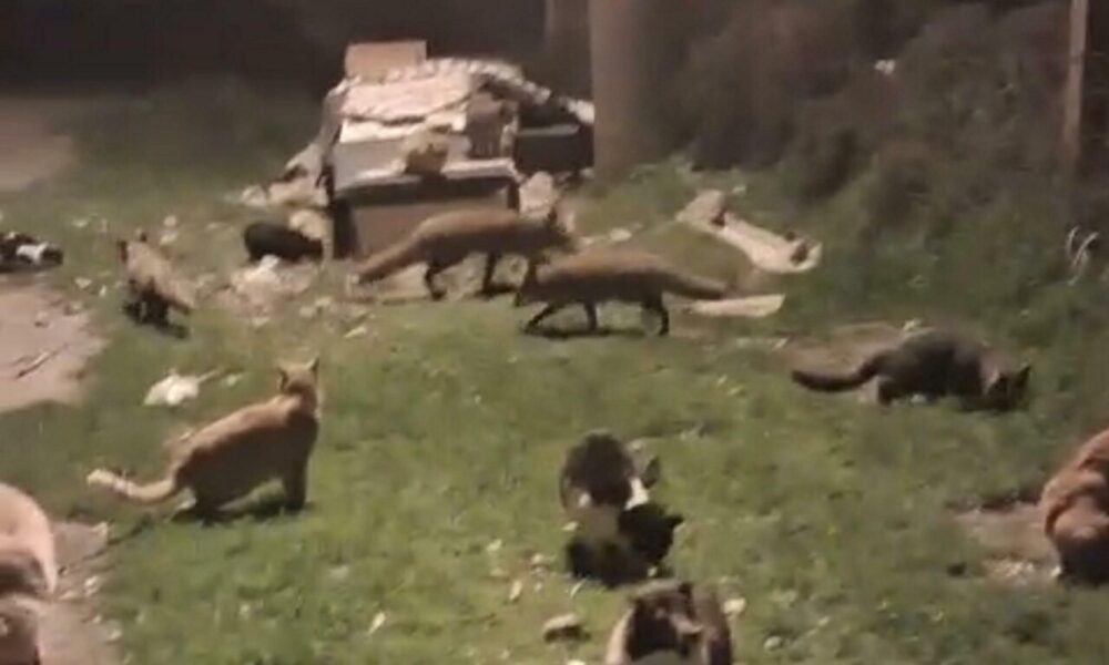 Kedi ve tilkilerin yan yana beslendiği anlar kamerada