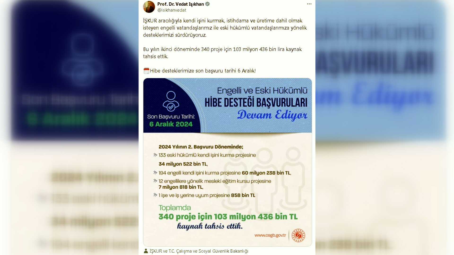 Bakan Vedat Işıkhan, sosyal medya hesabından yaptığı açıklamada, “İŞKUR aracılığıyla kendi işini kurmak, istihdama ve üretime dahil olmak isteyen engelli vatandaşlarımız ile eski hükümlü vatandaşlarımıza yönelik desteklerimizi sürdürüyoruz. Bu yılın 2nci döneminde 340 proje için 103 milyon 436 bin lira kaynak tahsis ettik. Hibe desteklerimize son başvuru tarihi 6 Aralık” ifadelerini kullandı.