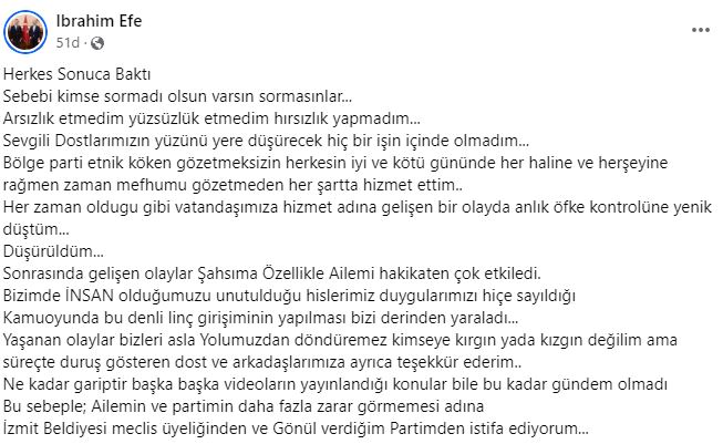 “Herkes sonuca baktı. Sebebi kimse sormadı, olsun varsın sormasınlar. Arsızlık etmedim, yüzsüzlük etmedim, hırsızlık yapmadım. Sevgili dostlarımızın yüzünü yere düşürecek hiçbir işin içinde olmadım. Bölge, parti, etnik köken gözetmeksizin herkesin iyi ve kötü gününde her haline ve her şeyine rağmen zaman mefhumu gözetmeden her şartta hizmet ettim. Her zaman olduğu gibi vatandaşımıza hizmet adına gelişen bir olayda anlık öfke kontrolüne yenik düştüm. Düşürüldüm. Sonrasında gelişen olaylar şahsıma özellikle ailemi hakikaten çok etkiledi. Bizim de insan olduğumuzu unutulduğu, hislerimiz, duygularımızı hiçe sayıldığı kamuoyunda bu denli linç girişiminin yapılması bizi derinden yaraladı. Yaşanan olaylar bizleri asla yolumuzdan döndüremez. Kimseye kırgın ya da kızgın değilim ama süreçte duruş gösteren dost ve arkadaşlarımıza ayrıca teşekkür ederim. Ne kadar gariptir başka başka videoların yayınlandığı konular bile bu kadar gündem olmadı. Bu sebeple; ailemin ve partimin daha fazla zarar görmemesi adına İzmit Belediyesi meclis üyeliğinden ve gönül verdiğim partimden istifa ediyorum.”