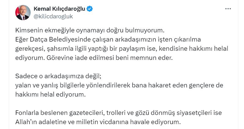 Eski CHP Genel Başkanı Kemal Kılıçdaroğlu, sosyal medya hesabından yaptığı açıklamada, “Kimsenin ekmeğiyle oynamayı doğru bulmuyorum. Eğer Datça Belediyesinde çalışan arkadaşımızın işten çıkarılma gerekçesi, şahsımla ilgili yaptığı bir paylaşım ise, kendisine hakkımı helal ediyorum. Görevine iade edilmesi beni memnun eder. Sadece o arkadaşımıza değil; yalan ve yanlış bilgilerle yönlendirilerek bana hakaret eden gençlere de hakkımı helal ediyorum. Fonlarla beslenen gazetecileri, trolleri ve gözü dönmüş siyasetçileri ise Allahın adaletine ve milletin vicdanına havale ediyorum” ifadelerini kullandı.