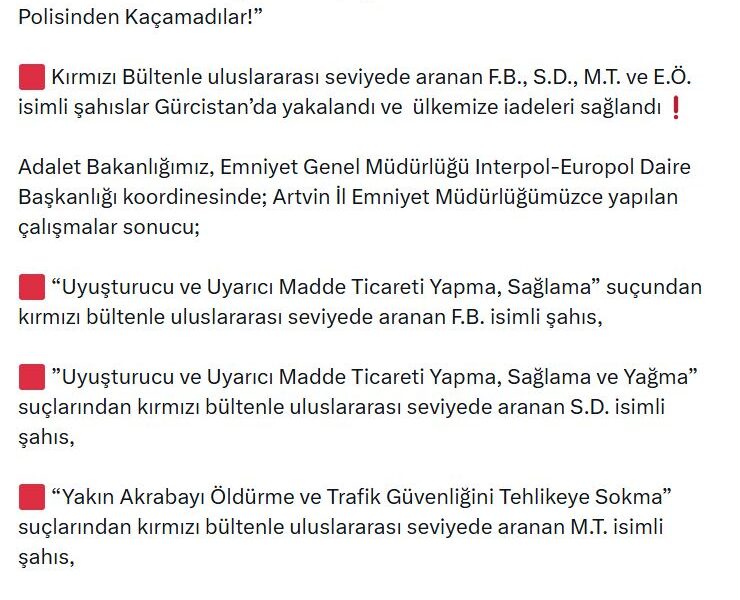 İçişleri Bakanı Yerlikayanın sosyal medya hesabından yaptığı açıklamaya göre; Adalet Bakanlığı ve Emniyet Genel Müdürlüğü koordinesinde yapılan çalışmalar sonucu, kırmızı bültenle aranan 4 suçlu Gürcistanda yakalanarak, Türkiyeye iadeleri sağlandı. Yakalananlardan F.B., Uyuşturucu ticareti, S.D., Uyuşturucu ticareti ve Yağma, M.T., Yakın akrabayı öldürme ve Trafik güvenliğini tehlikeye sokma, E.Ö., Yağma ile Kişiyi hürriyetinden yoksun kılma suçlarından kırmızı bültenle aranıyordu.