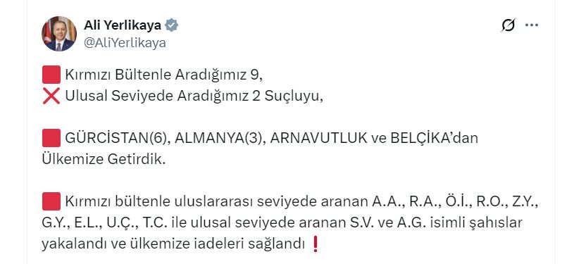 “İlgili ülkelerin kolluk birimleriyle yürütülen operasyonel iş birliğiyle; Bilişim sistemlerinin kullanılması suretiyle dolandırıcılık ve kooperatif yöneticilerinin kooperatifin faaliyeti kapsamında dolandırıcılık suçlarından kırmızı bültenle uluslararası seviyede aranan A.A. isimli şahıs Gürcistan’da, Kasten öldürmeye teşebbüs suçundan kırmızı bültenle uluslararası seviyede aranan R.A. isimli şahıs Gürcistan’da, İş yerinde silahla yağmaya teşebbüs, silahla geceleyin iş yerinde yağma, ruhsatsız ateşli silahlarla mermileri taşıma, silahla tehdit ve suç üstlenme suçlarından kırmızı bültenle uluslararası seviyede aranan Ö.İ. isimli şahıs Gürcistan’da, Çocuğun cinsel istismarı ve kişiyi hürriyetinden yoksun kılma suçlarından kırmızı bültenle uluslararası seviyede aranan R.O. isimli şahıs Gürcistan’da, Silahla birden fazla kişi ile birlikte konutta geceleyin yağma suçundan kırmızı bültenle uluslararası seviyede aranan Z.Y. isimli şahıs Almanya’da, Kasten öldürme suçundan kırmızı bültenle uluslararası seviyede aranan G.Y. isimli şahıs Almanya’da, Uyuşturucu veya uyarıcı madde ticareti yapma veya sağlama suçundan kırmızı bültenle uluslararası seviyede aranan E.L. isimli şahıs Almanya’da, Tasarlayarak öldürme, ruhsatsız ateşli silahlarla mermileri satın alma, taşıma veya bulundurma, kullanmak için uyuşturucu ve uyarıcı madde kabul etmek veya bulundurmak suçlarından kırmızı bültenle uluslararası seviyede aranan U.Ç. isimli şahıs Arnavutluk’ta, Hırsızlık (2 kez), nitelikli olarak konut dokunulmazlığını ihlal etme (2 kez), mala zarar verme (2 kez), iş yeri dokunulmazlığını ihlal etme suçlarından kırmızı bültenle uluslararası seviyede aranan T.C. isimli şahıs Belçika’da, Dolandırıcılık, mühür bozma, vergi usul kanununa muhalefet, 1072 sayılı kanuna aykırılık suçlarından ulusal seviyede aranan S.V. isimli şahıs Gürcistan’da, Dolandırıcılık, güveni kötüye kullanma, görevi yaptırmamak için direnme, hırsızlık suçlarından ulusal seviyede aranan A.G. isimli şahıs Gürcistan’da yakalandı ve ülkemize geri getirildi. Emeği geçenleri tebrik ediyorum. Hangi bültenle aranırsa aransın, nerede olursa olsun suç işleyenleri bir bir yakalayıp ülkemize geri getiriyoruz. Milletimizin huzuru ve güveni için kararlılıkla çalışıyoruz, çalışmaya da devam edeceğiz.”