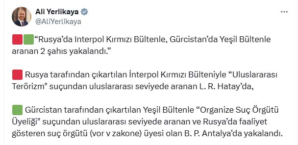 İçişleri Bakanı Yerlikayanın sosyal medya hesabından yaptığı açıklamaya göre; Emniyet Genel Müdürlüğü Interpol-Europol Daire Başkanlığı ile Göç İdaresi Başkanlığı koordinesinde, uluslararası düzeyde aranan 2 suçlu için Hatay ve Antalyada operasyon düzenlendi. İl Jandarma Komutanlıklarınca yürütülen operasyonlarda, Rusya tarafından çıkartılan Interpol kırmızı bülteniyle Uluslararası terörizm suçundan aranan L.R. Hatayda; Gürcistan tarafından çıkartılan yeşil bültenle Organize suç örgütü üyeliği suçundan aranan ve Rusyada faaliyet gösteren suç örgütü Vor v Zakone üyesi B.P. Antalyada yakalandı.