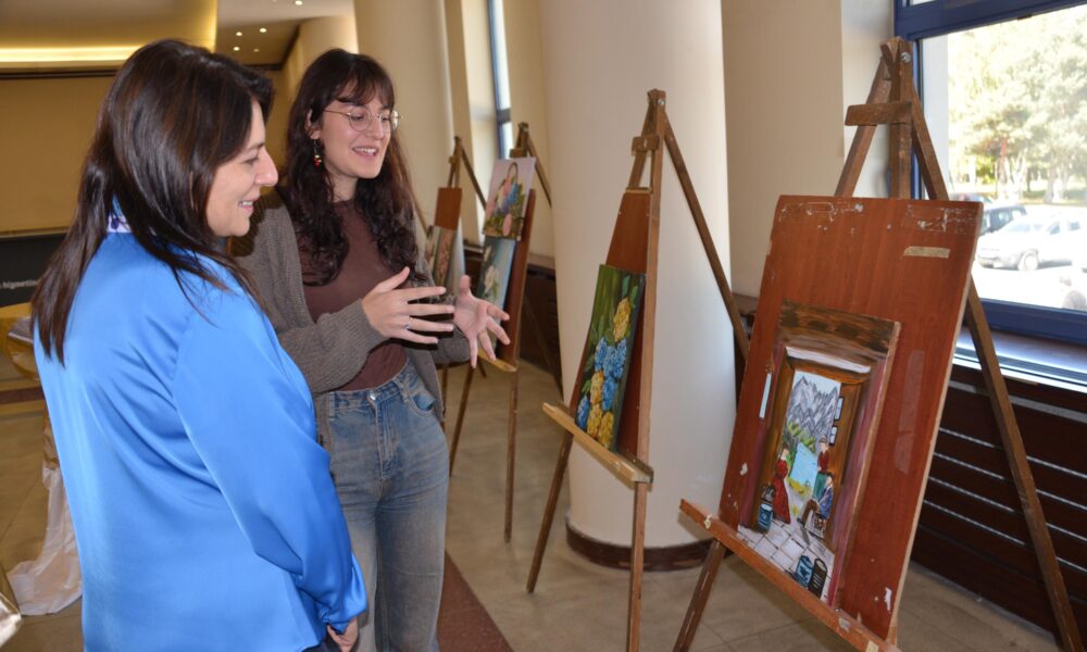 • Atatürk Üniversitesi Nenehatun Kültür Merkezi'nde ilk kişisel sergisini açan Elif Şen'in (Fotoğrafta solda) eserleri davetlilerin beğenisini topladı. Fotoğraf: Salih TEKİN / Erzurum,(DHA)