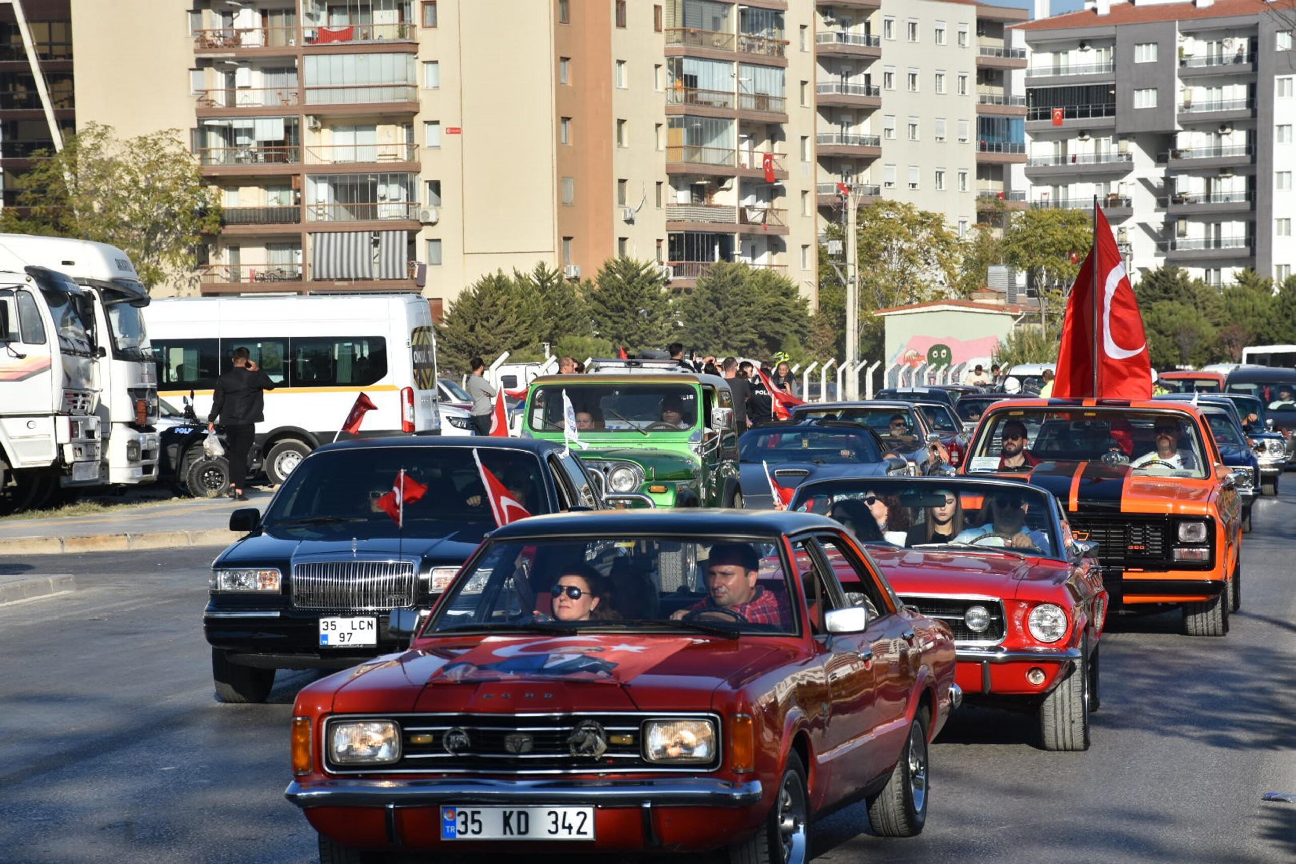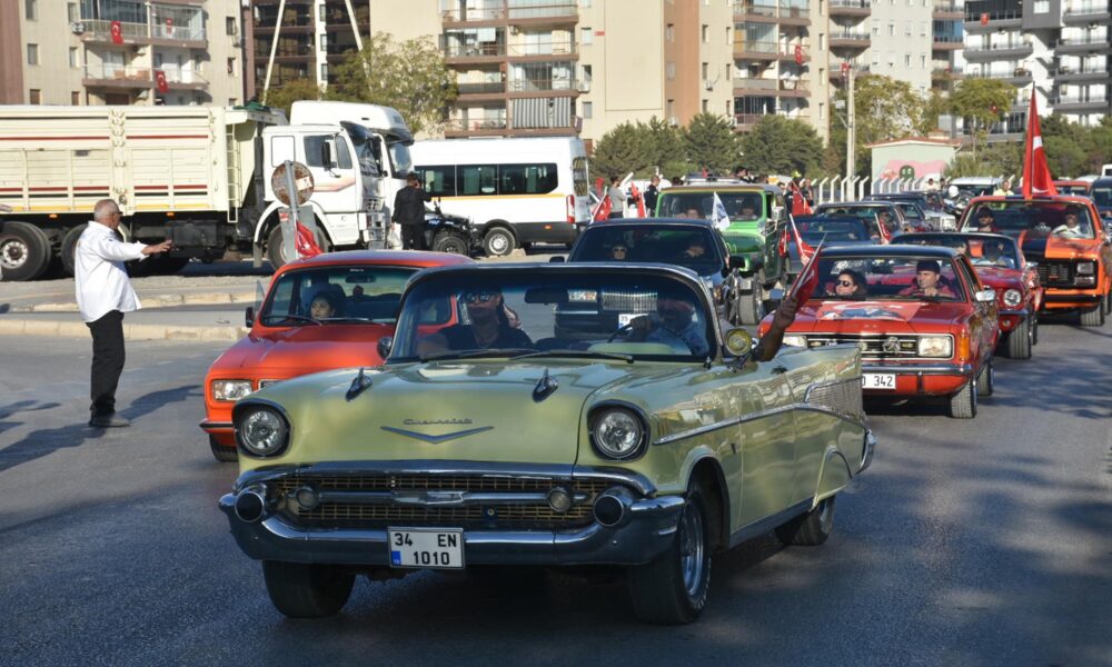 Cumhuriyetin 101inci kuruluş yıl dönümü, İzmirde gerçekleştirilen çeşitli etkinliklerle kutlandı. İzmir Klasik Otomobil Derneği üyeleri de kutlamalar kapsamında kortej düzenledi. Saat 15.30da Bayraklı Smyrna Meydanında toplanan 101 klasik otomobil sürücüsü, araçlarını Türk bayraklarıyla donattı. Etkinlikte konuşan İzmir Klasik Otomobil Derneği Başkanı Engin Turşak, “Klasik otomobil sevenler olarak Cumhuriyetin 101inci yıl dönümünde güzel bir kortej düzenledik. İnşallah güzel olacak. Araçlarımızla şehir turu atacağız” dedi.
