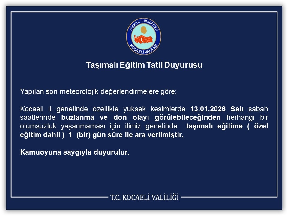 Kentin yüksek kesimlerinde meteorolojik verilere göre buzlanma ve don olması bekleniyor. Bu doğrultuda Kocaeli Valiliği’nden yapılan yazılı açıklamada, “Kocaeli il genelinde özellikle yüksek kesimlerde 13.01.2026 Salı sabah saatlerinde buzlanma ve don olayı görülebileceğinden herhangi bir olumsuzluk yaşanmaması için ilimiz genelinde taşımalı eğitime (özel eğitim dahil) 1 (bir) gün süre ile ara verilmiştir.” denildi.