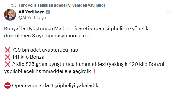 İçişleri Bakanı Ali Yerlikaya, Konyada uyuşturucu madde ticareti yapan şüphelilere yönelik düzenlenen 3 ayrı operasyonu sosyal medya hesabından paylaştı. Buna göre; İl Emniyet Müdürlüğü Narkotik Suçlarla Mücadele Şubesince gerçekleştirilen operasyonlarda, 739 bin uyuşturucu hap, 141 kilogram bonzai ve 2 kilo 825 gram uyuşturucu hammaddesi ele geçirildi, 4 şüpheliyi yakalandı.