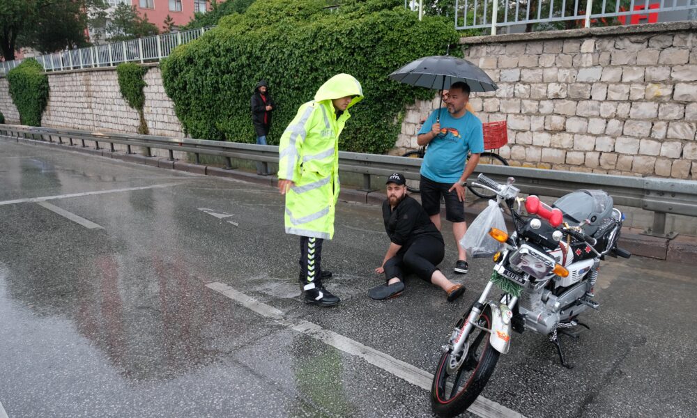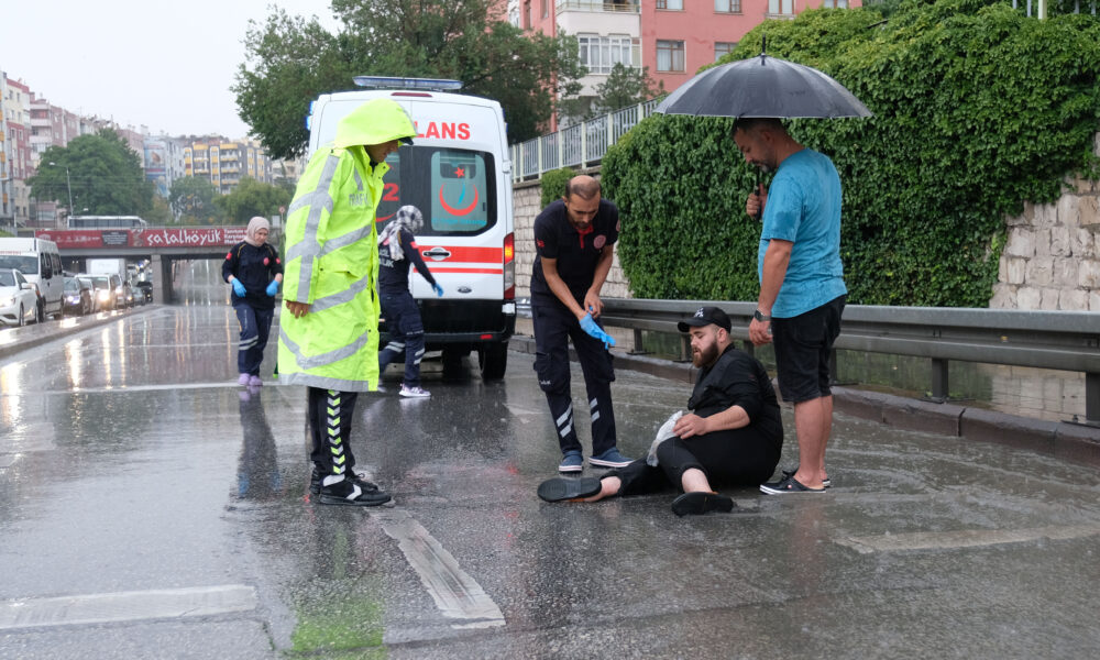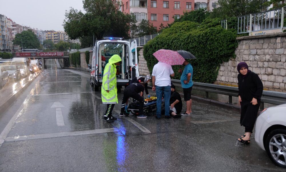 Selçuklu ilçesi Rauf Denktaş Caddesi’ndeki Sille Alt Geçit girişinde motosikletiyle ilerleyen Muhammet Kasım, kayganlaşan yolda Kasım Selçuk yönetimindeki 34 JM 6669 plakalı otomobile çarptı. Hafif yaralanarak yere düşen Muhammet Kasım’a yoldan geçen bir vatandaş şemsiye tuttu. Bir süre yerde ambulans bekleyen Kasım, gelen ambulansla Konya Numune Hastanesi’ne kaldırıldı. Polis kazayla ilgili soruşturma başlattı.