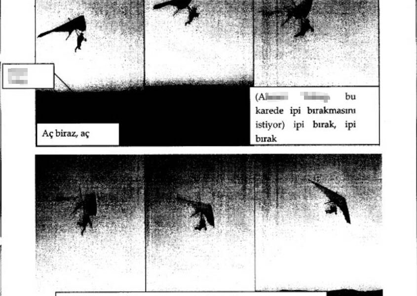 Dava dosyasında kaza anına ilişkin görüntüler ve bilirkişi raporu da yer aldı. Raporda, Onur Kılıçlının cep telefonu ile kayda alınan görüntülerde, A.Y.M.nin uçuş anında telsiz aracılığıyla Onur Kılıçlı ve B.C. ile konuştuğunun net bir şekilde anlaşıldığı belirtildi. A.Y.M.nin her uçuştan önce sporcuya bağlı halatı kontrol ettiği, sporcuya telsiz vasıtasıyla hazır olup olmadığını sorduğu ve aldığı cevaba göre elinde bulunan kırmızı bayrağı kaldırıp halatın çekilmesi konusunda talimat verdiğinin net bir şekilde görüldüğü ve anlaşıldığı ifade edildi. Kaza anında ise A.Y.M.nin kanatları açması ve düşüş anında ipi bırakması yönünde Kılıçlıya talimat verdiği ifade edildi.