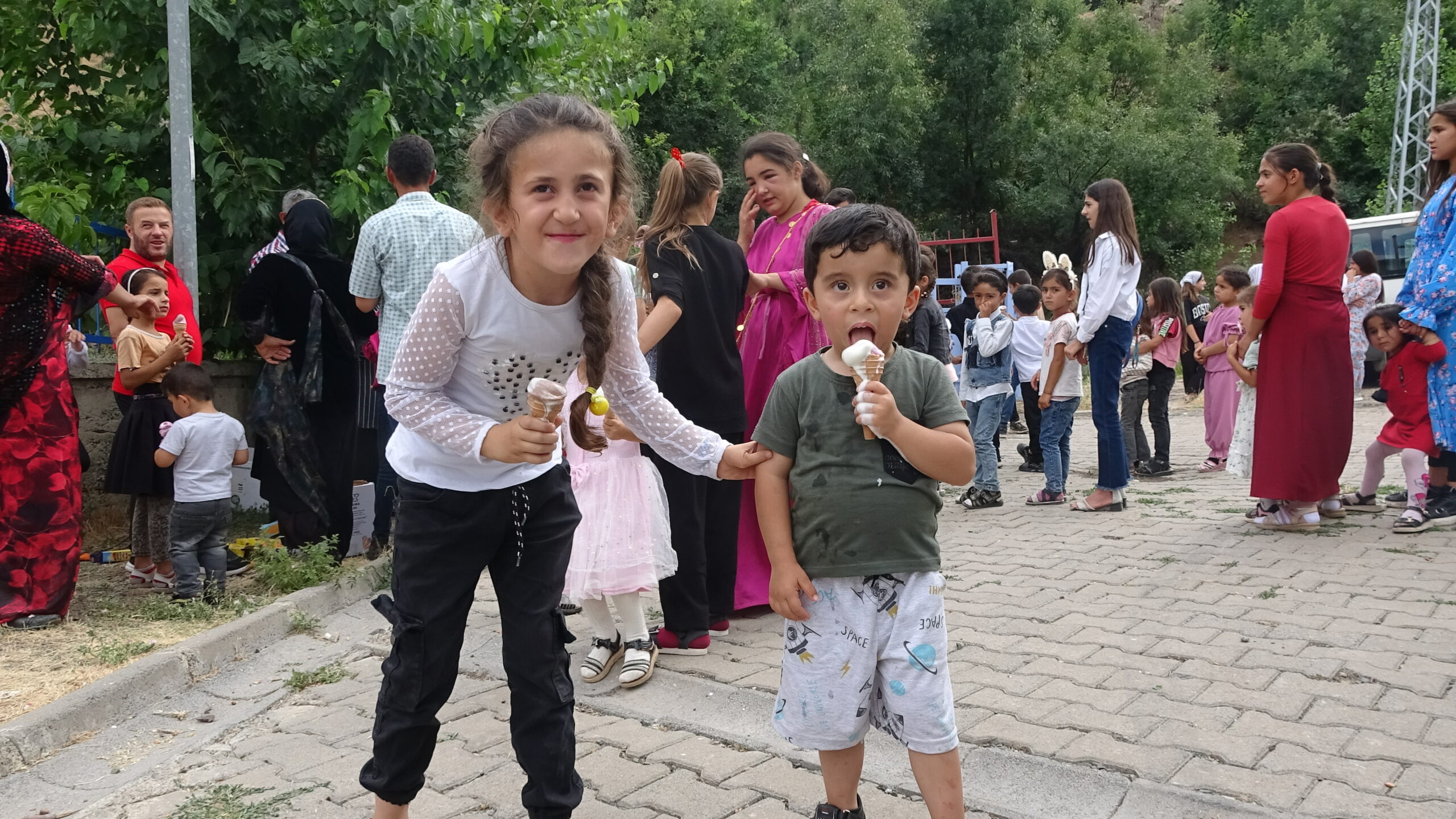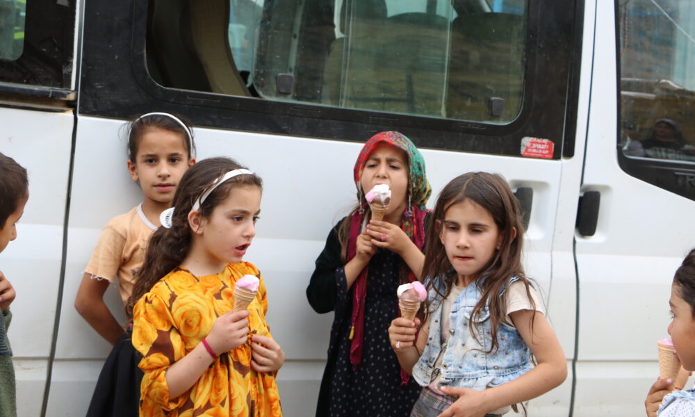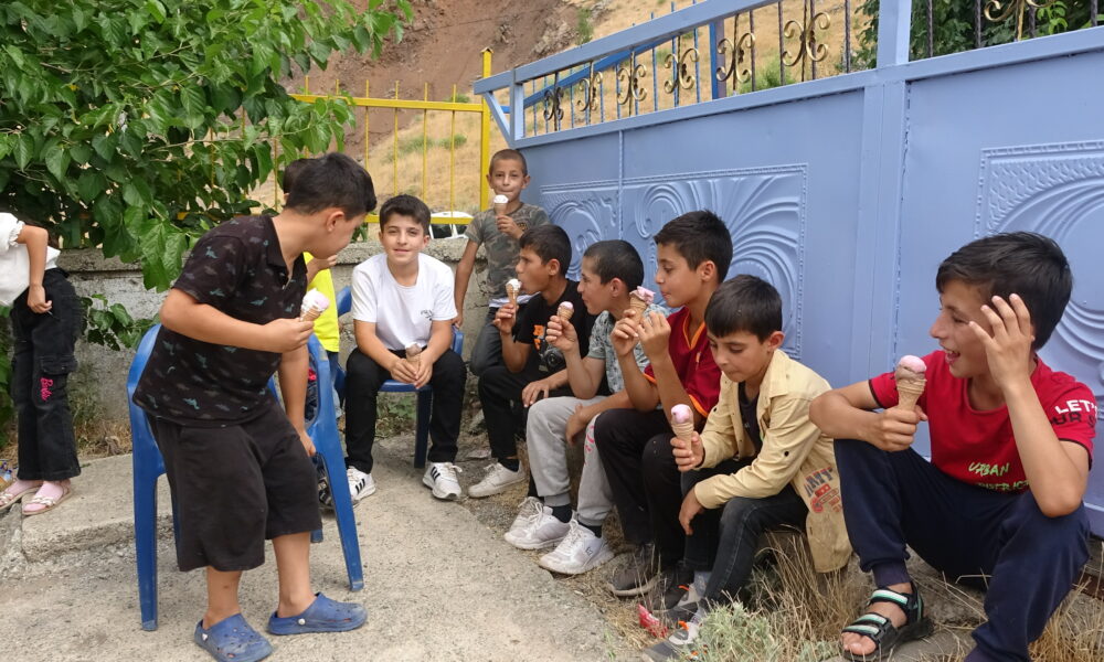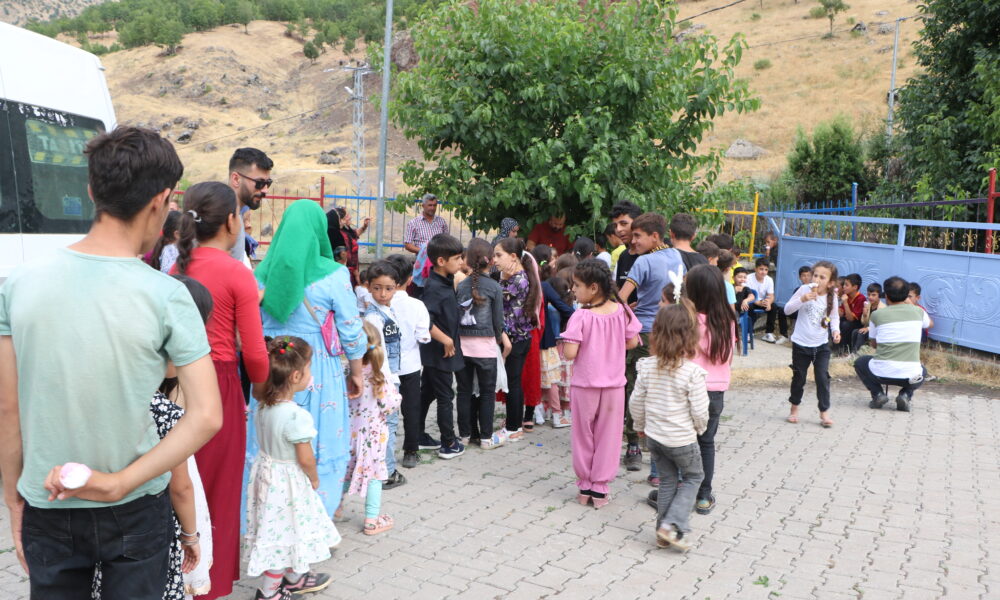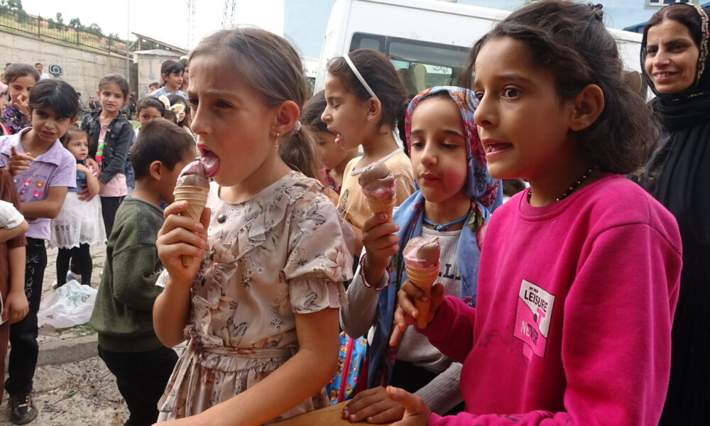 Fahri Geylani ise “Bugün hava sıcaklığının 42 dereceyi gördüğü köyde ve mezrada etkinliğimiz yapmak istedik. Çocuklar çok sevindiler. Gönüllülerimizin sağladığı destekle bugün 300 çocuğa dondurma dağıttık. Köyde market veya bakkal yok. Gittiğimiz bazı köylerde ilk defa dondurma yediğini söyleyen çocuklar bile oluyor” diye konuştu.