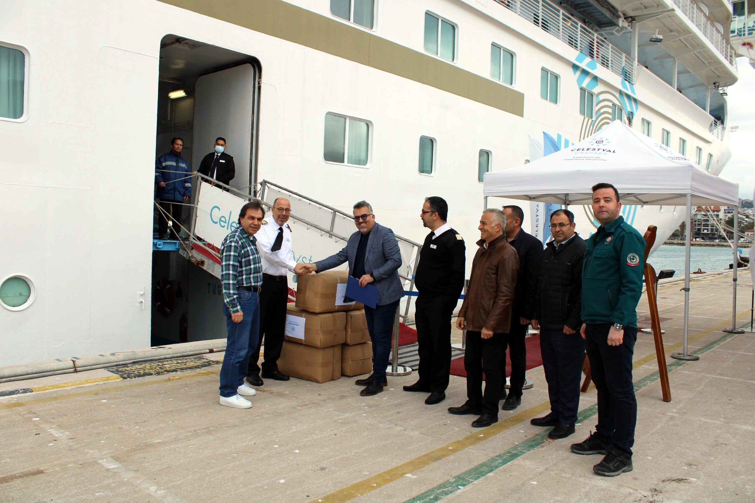 Sezonun ilk seferini yapan Yunan bayraklı ‘Celestyal Crystal’ adlı kruvaziyer, 600 turist ve 400 personelle Kuşadası Limanı’na yanaştı. Gemiyle ilçeye, Kahramanmaraş depremlerinin ardından bölgeye gönderilmek üzere yardım malzemesi de getirildi. Battaniye, uyku tulumu, yetişkin bezi, bebek bezi, şampuan, giyim ve gıda ürünlerinin bulunduğu yardımlar da limanda indirilip AFAD’a iletilmek üzere Kuşadası Kaymakamlığı’na bağlı Sosyal Yardımlaşma yetkilileri Rüstem Korkmaz ve İlyas Cindoruk’a teslim edildi. Kuşadası İlçe Tarım Müdürü Gürsel Doğan, gıda ürünlerini, son kullanma tarihlerini kontrol ederek teslim aldı.
