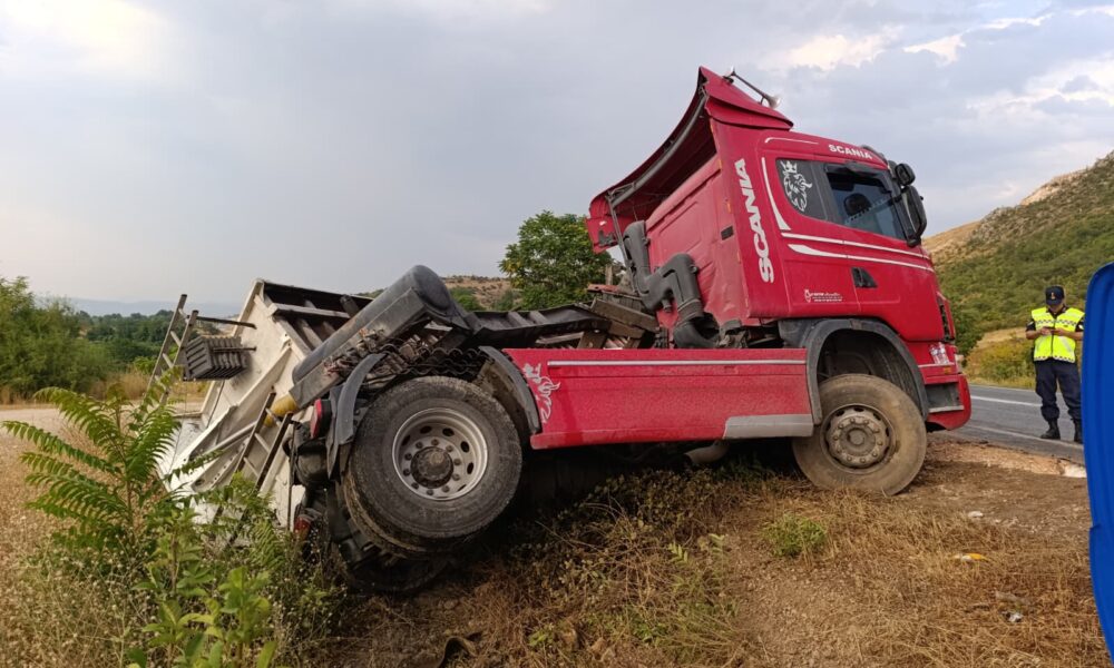 Kaza, İnegöl-Yenişehir yolu Boğazköy Mahallesi mevkisinde meydana geldi. İnegölden Yenişehirdeki Yüksek Hızlı Tren (YHT) inşaatına kum taşıyan Alper A. (47) yönetimindeki 08 AAB 173 plakalı TIR, yağış nedeniyle kayganlaşan yolda sürücüsünün direksiyon hakimiyetini kaybetmesiyle yoldan çıkarak devrildi. Yaralanan sürücü, çevredekiler tarafından TIRdan çıkarılırken, ihbarla olay yerine jandarma ve sağlık ekipleri sevk edildi. Yaralılar, ambulansla kaldırıldığı İnegöl Devlet Hastanesinde tedaviye alındı. Sürücünün durumunun iyi olduğu öğrenilirken, kazayla ilgili soruşturma başlatıldı.