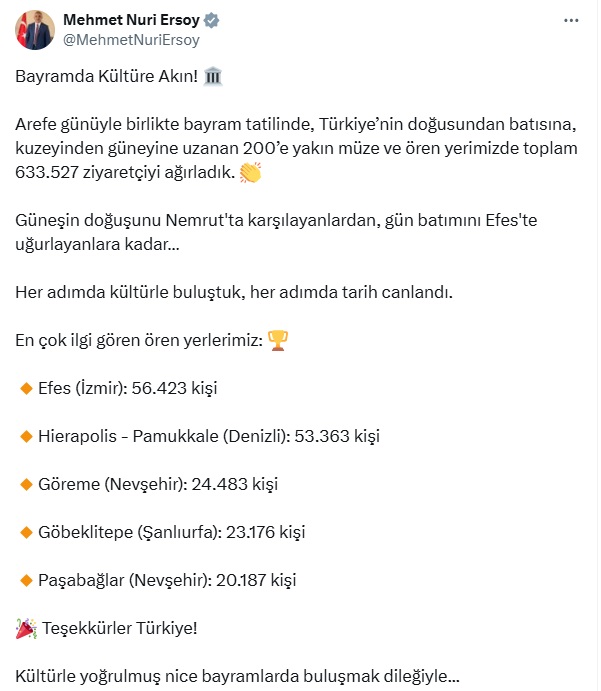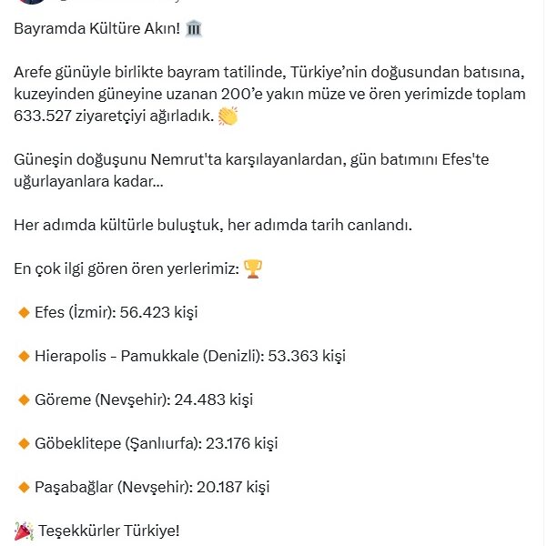 Bakan Ersoy, sosyal medya hesabından yaptığı açıklamada, “Arefe günüyle birlikte bayram tatilinde, Türkiye’nin doğusundan batısına, kuzeyinden güneyine uzanan 200’e yakın müze ve ören yerimizde toplam 633 bin 527 ziyaretçiyi ağırladık. Güneşin doğuşunu Nemrutta karşılayanlardan, gün batımını Efeste uğurlayanlara kadar her adımda kültürle buluştuk, her adımda tarih canlandı. En çok ilgi gören ören yerlerimiz, Efes (İzmir): 56 bin 423 kişi, Hierapolis-Pamukkale (Denizli): 53 bin 363 kişi, Göreme (Nevşehir): 24 bin 483 kişi, Göbeklitepe (Şanlıurfa): 23 bin 176 kişi, Paşabağlar (Nevşehir): 20 bin 187 kişi. Teşekkürler Türkiye. Kültürle yoğrulmuş nice bayramlarda buluşmak dileğiyle” dedi.