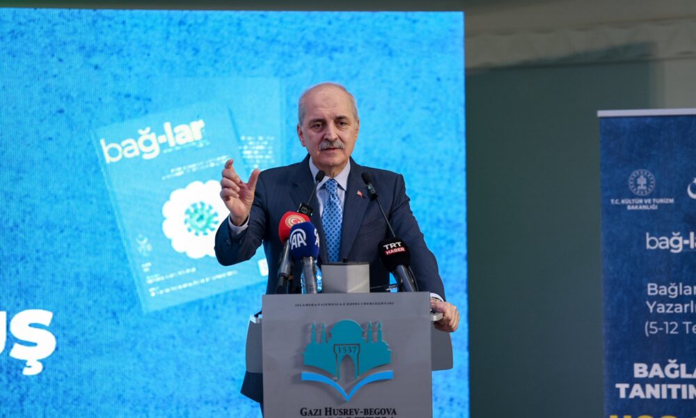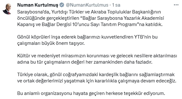 TBMM Başkanı Numan Kurtulmuş, Srebrenitsa Soykırımını Uluslararası Düşünme ve Anma Günü programlarına katılmak ve resmi temaslarda bulunmak üzere geldiği Bosna Hersekin başkenti Saraybosna’da, Yurtdışı Türkler ve Akraba Topluluklar Başkanlığının (YTB) öncülüğünde gerçekleştirilen Bağlar Saraybosna Yazarlık Akademisi Kapanış ve Bağlar Dergisi 10uncu Sayı Tanıtım Programına katıldı. Programa ilişkin sosyal medya hesabından paylaşımda bulunan Kurtulmuş, “Gönül köprüleri inşa ederek bağlarımızı kuvvetlendiren YTB’nin bu çalışmaları büyük önem taşıyor. Kültür ve medeniyet mirasımızın korunması ve gelecek nesillere aktarılması adına bu tür çalışmaların değeri her zamankinden daha fazladır. Türkiye olarak, gönül coğrafyamızdaki kardeşlik bağlarını sağlamlaştırmak ve ortak değerlerimizi yaşatmak için kararlılıkla çalışmaya devam edeceğiz. Bu anlamlı organizasyonu hayata geçiren herkese teşekkür ediyorum” dedi.