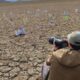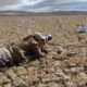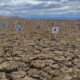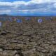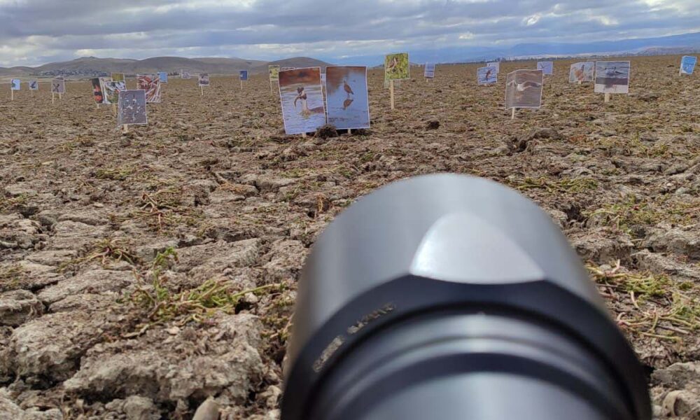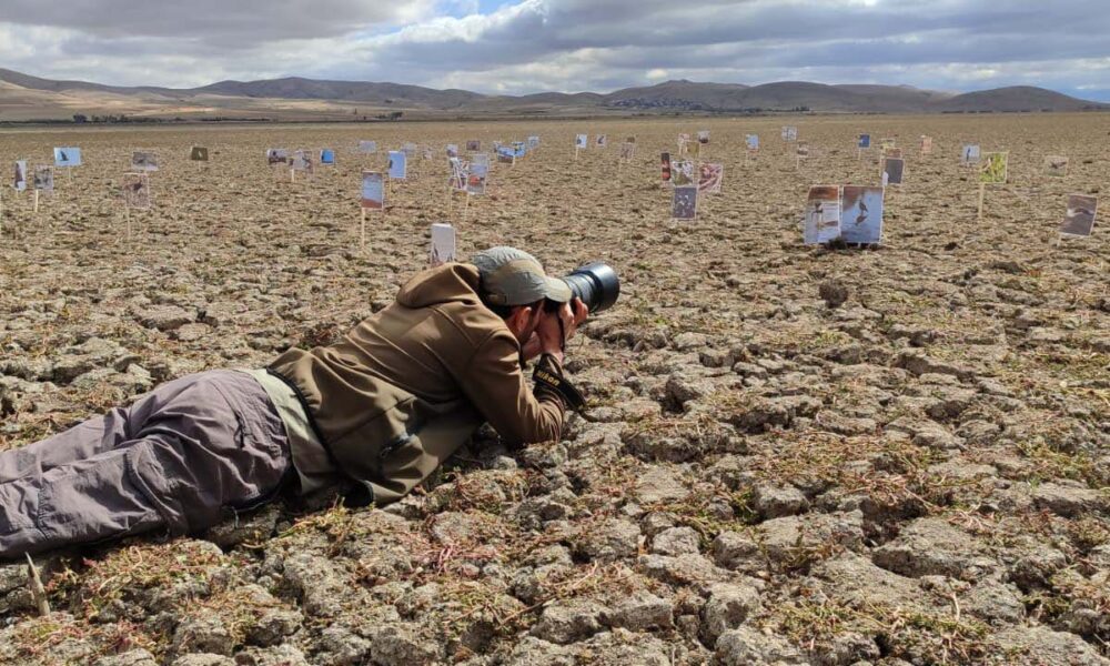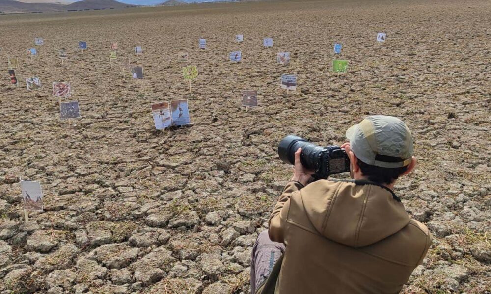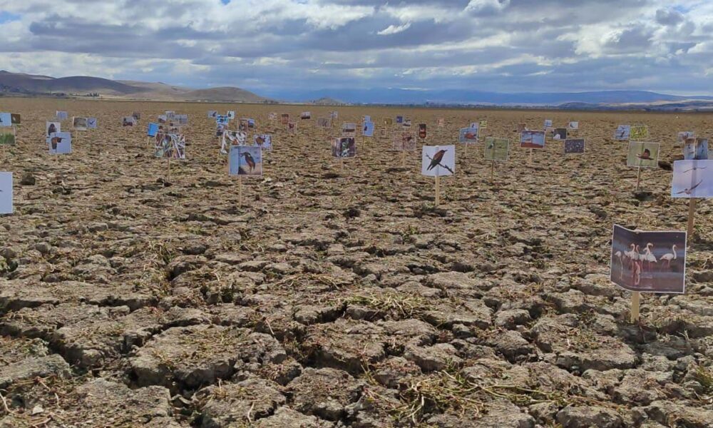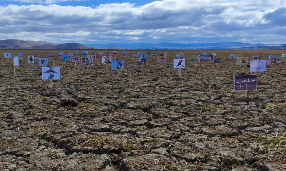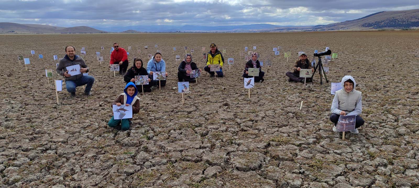 Kuruyan gölde, daha önce çekilen kuşların fotoğraflarıyla kuraklığa dikkat çektiler