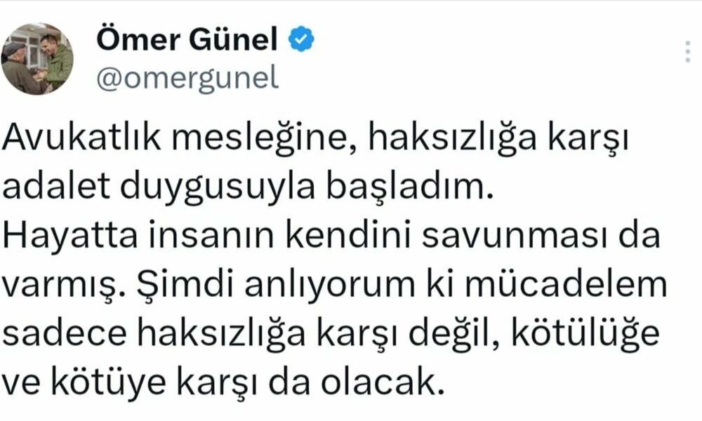 Kuşadası Belediye Başkanı Ömer Günel, İstanbulda bu sabah gözaltına alınmasıyla ilgili sanal medya hesapları üzerinden bir paylaşım yaptı. Başkan Günel paylaşımında, “Avukatlık mesleğine, haksızlığa karşı adalet duygusuyla başladım. Hayatta insanın kendini savunması da varmış. Şimdi anlıyorum ki mücadelem sadece haksızlığa karşı değil, kötülüğe ve kötüye karşı da olacak” dedi.
