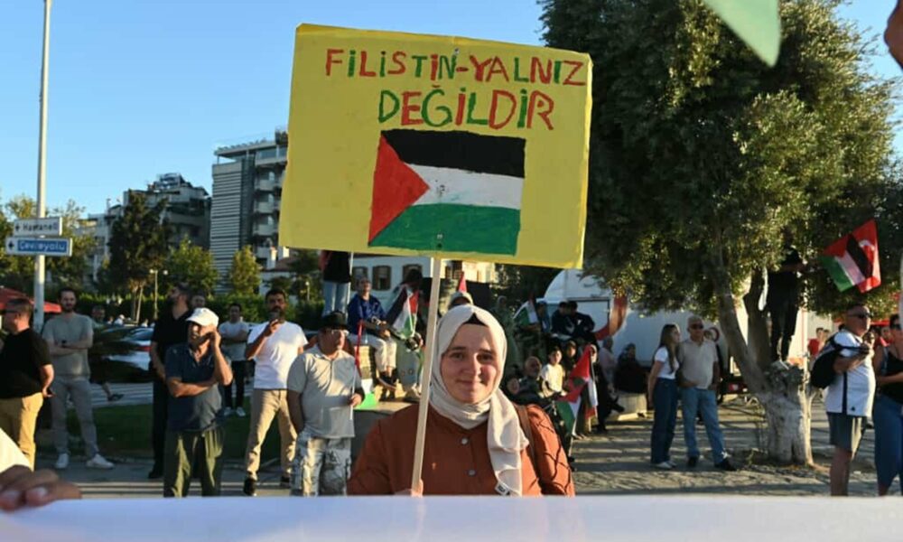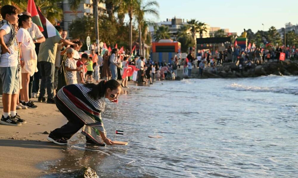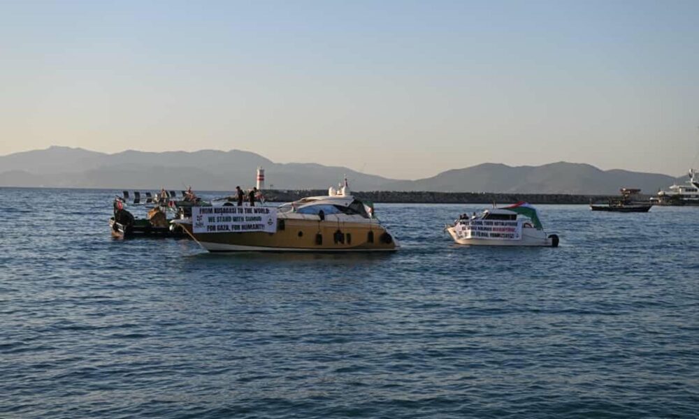 Kuşadası Filistin Platformu, Filistin’e yardım götüren küresel Sumud Filosuna destek olmak amacıyla İsmail Cem Dostluk ve Barış Meydanı’nda program düzenledi. Çeşitli sivil toplum kuruluşlarıyla iş birliği içerisinde gerçekleştirilen etkinliğe katılanlar ellerinde, ‘Filistin yalnız değildir’, ‘Soykırım bitsin’ ve ‘Nefes almak yetmiyor yaşamak için’ yazılı pankart ve döviz taşıdı. Vatandaşlara, denize açılan balıkçı tekneleri ve yat sahipleri de destek verdi. Etkinlikte meydana kurulan ekrandan, Sumud Filosu’na canlı bağlantı yapıldı. Etkinliğin sonunda çocuklar Filistin bayraklı kendi yaptıkları oyuncak tekneleri suya bıraktı.