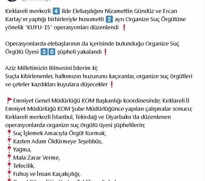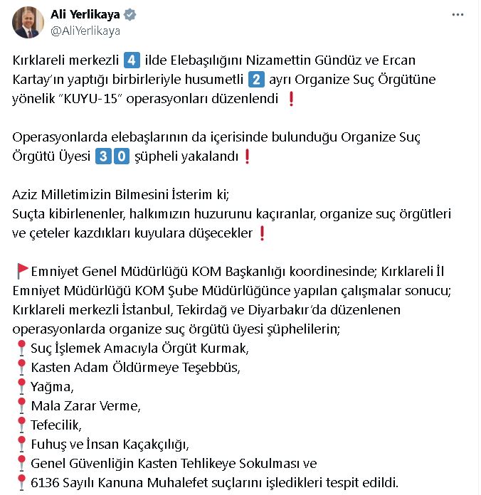 Bakan Yerlikayanın sosyal medya hesabından yaptığı açıklamaya göre, Kırklareli merkezli İstanbul, Tekirdağ ve Diyarbakırda elebaşılığını Nizamettin Gündüz ve Ercan Kartay’ın yaptığı birbirleriyle husumetli 2 ayrı organize suç örgütüne yönelik Kuyu-15 operasyonları düzenlendi. Operasyonlarda, suç İşlemek amacıyla örgüt kurmak, kasten adam öldürmeye teşebbüs, yağma, mala zarar verme, tefecilik, fuhuş ve insan kaçakçılığı, genel güvenliğin kasten tehlikeye sokulması ve 6136 sayılı kanuna muhalefet suçlarını işledikleri tespit edilen organize suç örgütü üyesi 30 şüpheli yakalandı. Operasyonlarda 8 adet ruhsatsız tabanca, 2 adet ruhsatsız tüfek ve çok sayıda fişek ele geçirildi.