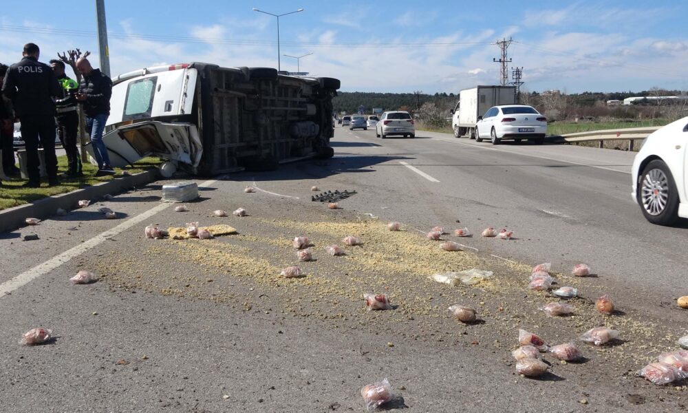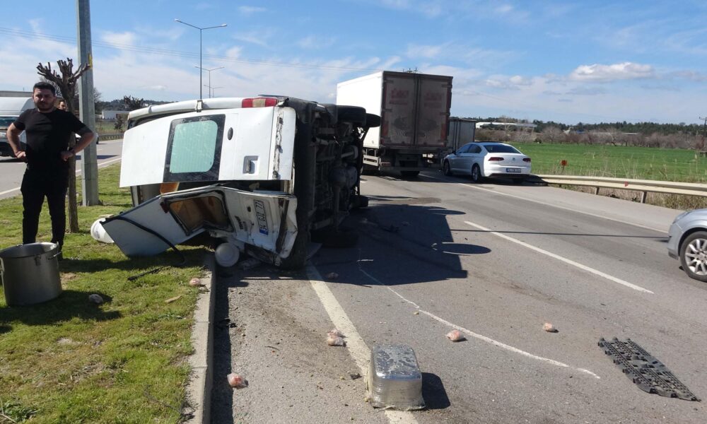 ÇANAKKALEde, lastiği patlayıp devrilen minibüsün sürücüsü Cumali Sarıoğlu (29), yaralandı.Kaza, saat 11.00 sıralarında, Çanakkale-Ezine kara yolunda meydana geldi. Bir yemek firmasına ait olan Cumali Sarıoğlunun kullandığı 34 GJZ 77 plakalı minibüs, Ezine istikametine seyir halindeyken lastiği patladı ve yol kenarındaki bariyerlere çarpıp yan yattı. Yemekler yola savruldu. Araçta sıkışan sürücü Sarıoğlu, çevredekiler ve bölgeye sevk edilen ekipler tarafından çıkarıldı. Sağlıkçıların ilk müdahalesini yaptığı Sarıoğlu, ambulansla Çanakkale Mehmet Akif Ersoy Devlet Hastanesine götürüldü. Sarıoğlunun tedavisinin, yoğun bakım ünitesinde sürdüğü öğrenildi. Polis ekipleri kazayla ilgili soruşturma başlattı.