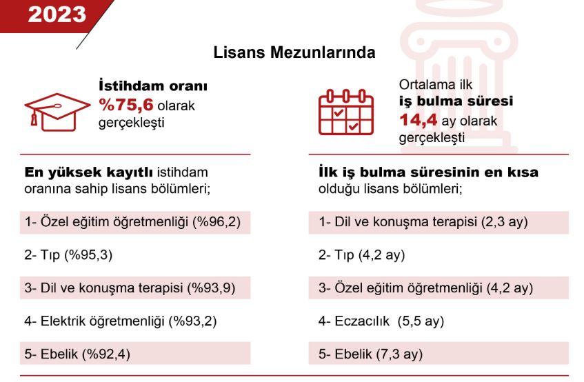 Türkiye İstatistik Kurumu, 2023 yılına ilişkin yükseköğretim istihdam göstergelerini açıkladı. Buna göre; lisans mezunlarının kayıtlı istihdam oranı 2022 yılında yüzde 75,1 iken, 2023 yılında yüzde 75,6 olarak gerçekleşti. Ön lisans mezunları için kayıtlı istihdam oranı 2022 yılında yüzde 67,3 iken, 2023 yılında yüzde 67,7 olarak hesaplandı. Lisans seviyesinde en yüksek kayıtlı istihdama sahip olan bölümler yüzde 96,2 ile özel eğitim öğretmenliği, yüzde 95,3 ile tıp, yüzde 93,9 ile dil ve konuşma terapisi, yüzde 93,2 elektrik öğretmenliği ve yüzde 92,4 ile ebelik oldu. Lisans seviyesinde kayıtlı istihdam oranının en yüksek olduğu ilk 5 alan; yüzde 87,4 ile sağlık ve refah, yüzde 83,7 ile mühendislik, yüzde 79,8 ile imalat ve inşaat, yüzde 79,6 ile eğitim, bilişim ve iletişim teknolojileri, yüzde 74,8 ile iş, yönetim ve hukuk oldu.