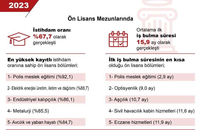 Ön lisans seviyesinde en yüksek kayıtlı istihdama sahip olan bölümler yüzde 92,1 ile polis meslek eğitimi, yüzde 88,7 ile elektrik enerjisi üretim, iletim ve dağıtımı, yüzde 86,1 ile endüstriyel kalıpçılık, yüzde 85,5 ile metalurji, yüzde 84,7 avcılık ve yaban hayatı ve yüzde 84,7 ile kaynak teknolojisi oldu. Ön lisans mezunlarının eğitim ve öğretim alanlarına göre kayıtlı istihdam oranının en yüksek olduğu ilk 5 alan; yüzde 77,3 ile mühendislik, imalat ve inşaat, yüzde 71,7 ile doğa bilimleri, matematik ve istatistik, yüzde 71 ile hizmetler, yüzde 70,4 ile bilişim ve iletişim teknolojileri, yüzde 69,6 ile tarım, ormancılık, balıkçılık ve veterinerlik olarak gerçekleşti.