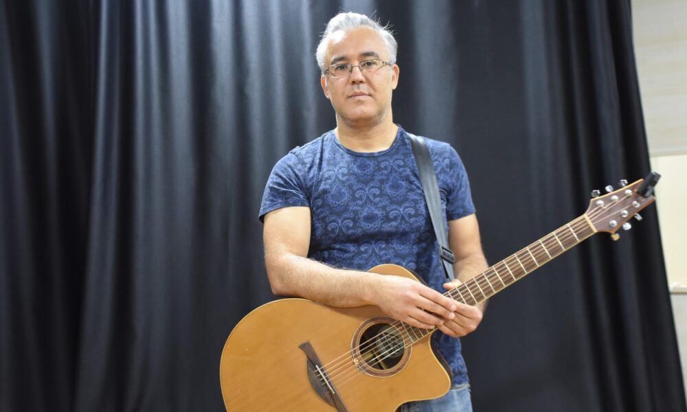 • İzmir'in Bornova ilçesindeki Sıdıka Rodop Anadolu Lisesi edebiyat öğretmeni Serdar Bozkır (43), Filistin'de yaşanan savaşa tepkilerini dile getirmek için şarkı yapıp besteledi. Fotoğraf: Nevra UÇKAÇ / İzmir, (DHA)