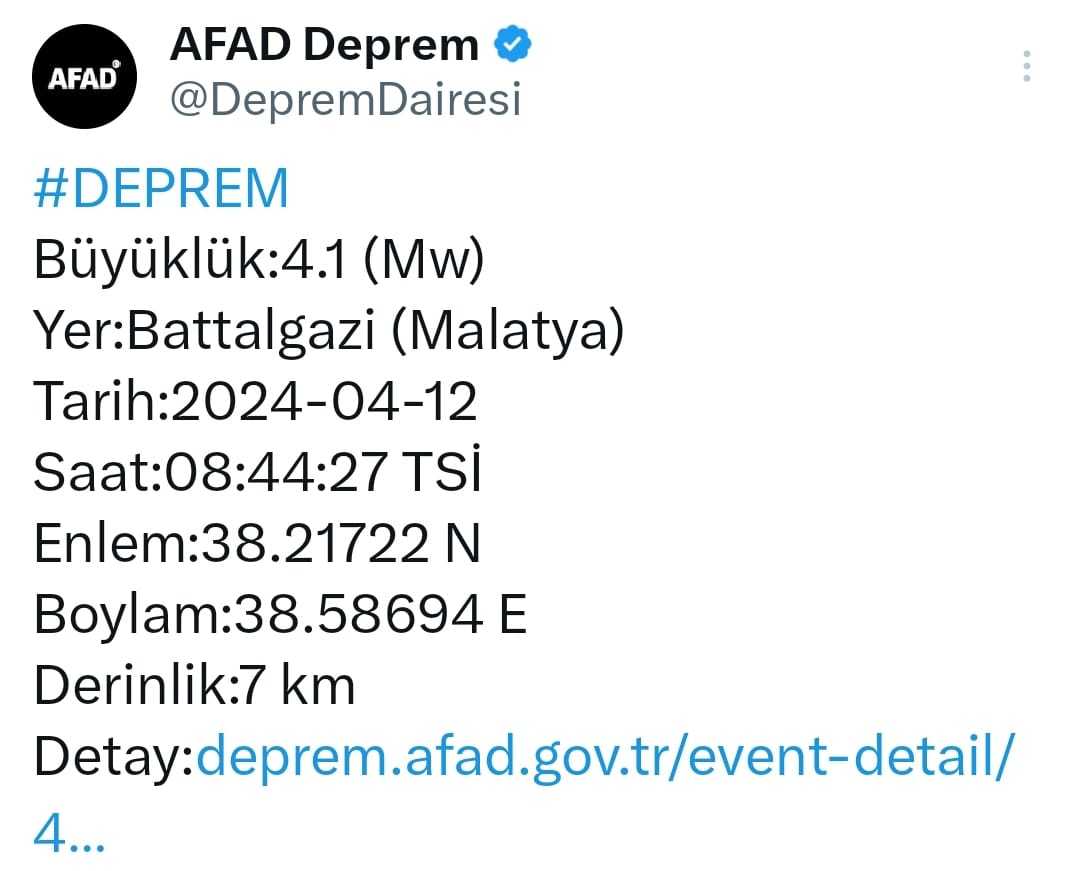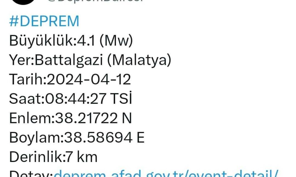 MALATYAnın Battalgazi ilçesinde Richter ölçeğine göre 4.1 büyüklüğünde deprem meydana geldi. Depremde ilk belirlemelere göre herhangi bir olumsuzluk yaşanmadı.Afet ve Acil Durum Yönetimi Başkanlığının (AFAD) verilerine göre, saat 08.44’te merkez üssü Malatya’nın Battalgazi ilçesinde 4.1 büyüklüğünde deprem meydana geldi. Deprem yerin 7 kilometre derinliğinde kaydedildi. AFAD ve ilgili kurumların yaptığı saha taramasında ilk belirlemelere göre depremde herhangi bir olumsuzluk yaşanmadı. DHA