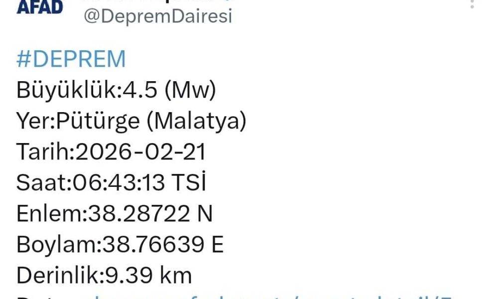 Afet ve Acil Durum Yönetimi Başkanlığının (AFAD) verilerine göre, saat 06.43te merkez üssü Malatyanın Pütürge ilçesi olan 4.5 büyüklüğünde deprem oldu. Yerin 9,39 kilometre derinliğinde meydana gelen sarsıntı, kısa süreli tedirginliğe neden oldu. Çevre il ve ilçelerden de hissedilen depremde ilk belirlemelere göre herhangi bir olumsuzluk yaşanmadı. AFAD tarafından yapılan açıklamada gelişmelerin takip edildiği bildirildi.