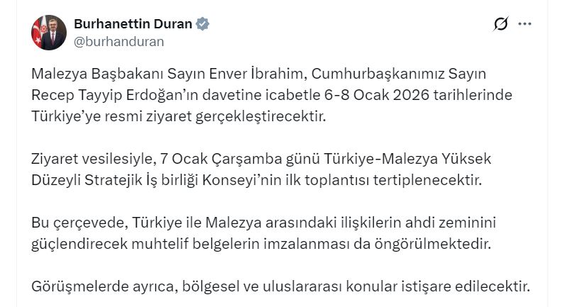 İletişim Başkanı Duran, sanal medya hesabından yaptığı açıklamada, “Malezya Başbakanı Sayın Enver İbrahim, Cumhurbaşkanımız Sayın Recep Tayyip Erdoğan’ın davetine icabetle 6-8 Ocak 2026 tarihlerinde Türkiye’ye resmi ziyaret gerçekleştirecektir. Ziyaret vesilesiyle, 7 Ocak Çarşamba günü Türkiye-Malezya Yüksek Düzeyli Stratejik İş birliği Konseyi’nin ilk toplantısı tertiplenecektir. Bu çerçevede, Türkiye ile Malezya arasındaki ilişkilerin ahdi zeminini güçlendirecek muhtelif belgelerin imzalanması da öngörülmektedir. Görüşmelerde ayrıca, bölgesel ve uluslararası konular istişare edilecektir” dedi.