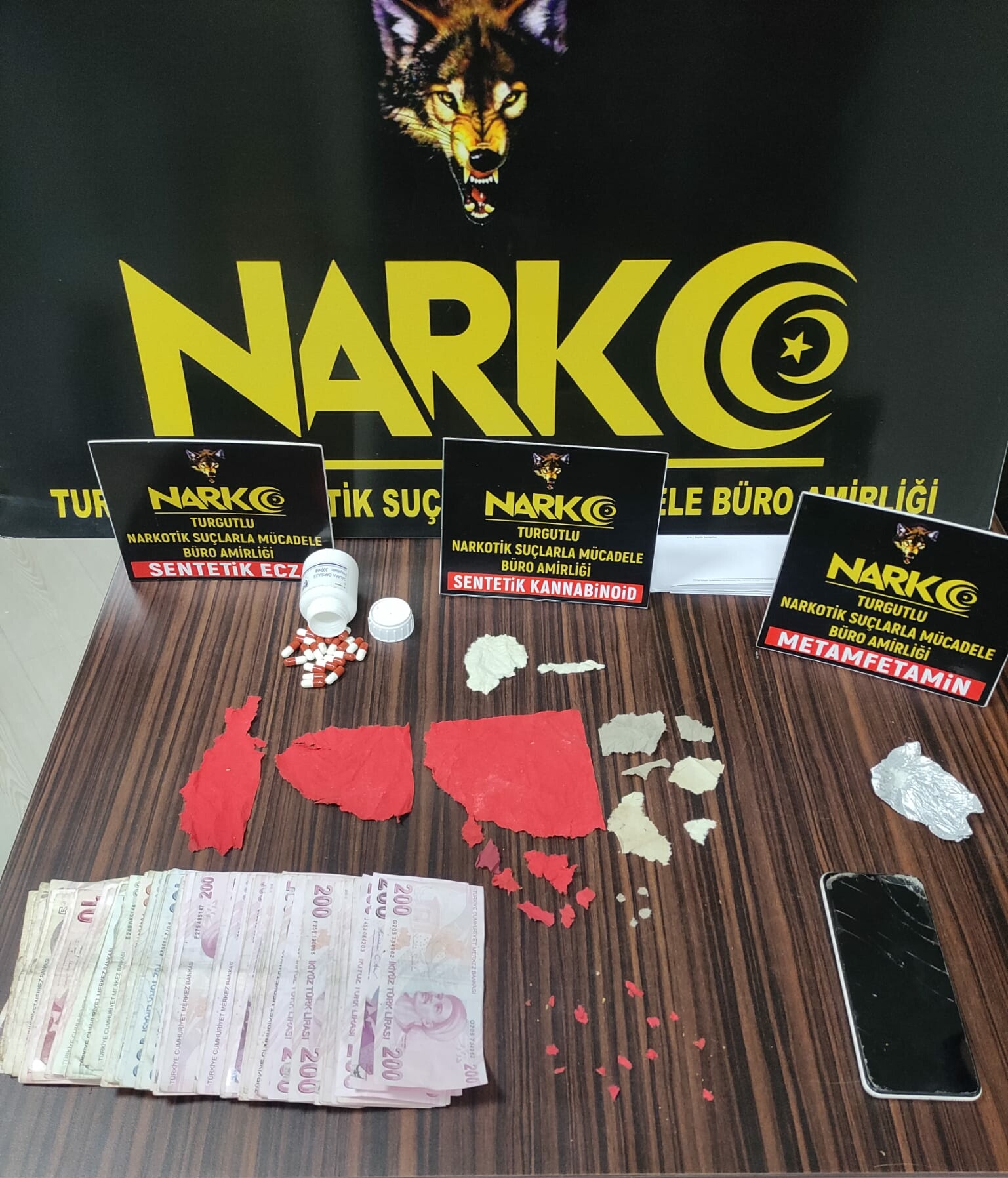 Manisa İl Emniyet Müdürlüğü Narkotik Suçlarla Mücadele Şube Müdürlüğü Turgutlu Narkotik Büro Amirliği ekipleri, Cumhuriyet Başsavcılığı koordinesinde ilçe genelinde uyuşturucu madde ticareti yapan kişilere yönelik çalışma başlattı. Ekipler, sokakta uyuşturucu kullandığı tespit edilen bir kişide ele geçirilen maddeyle ilgili yaptıkları araştırmada, uyuşturucu maddenin İ.Y.’den temin edildiğini belirledi. Bunun üzerine harekete geçen polis, şüpheliyi düzenlenen operasyonla yakaladı. Şüphelinin üzerinde yapılan aramada, 36 parça halinde peçeteye emdirilmiş bonzai (sentetik kannabinoid), 21 adet sentetik ecza, bir miktar metamfetamin ve 9 bin 640 TL nakit para ele geçirildi.