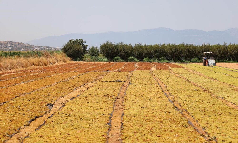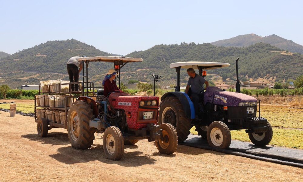 Turgutlu ilçesinde Sultani çekirdeksiz üzüm hasadı sürüyor. Ağustos ayında başlayan ve eylül sonuna kadar süren hasat döneminde üzümler, traktörlerle kurutma alanlarına taşınıyor. Üreticiler, üzümleri bandırma suyu olarak bilinen özel karışıma batırdıktan sonra bezlerin üzerine seriyor. Üretici Burcu Sever Özgenç, “Bandırma yapılan üzümler 10 günde, yapılmayanlar ise 21 günde kuruyor. Bu da zaman ve iş gücünden tasarruf sağlıyor” dedi. Gündüz sıcaklarında hasat ve sergi işlemlerini yaptıklarını, gece de hırsızlık ve yabani hayvanlara karşı tüfekle ürünlerin başında nöbet tuttuklarını belirten Özgenç, “Üzümleri sergi alanına seriyoruz. Akşam olunca ürünleri yalnız bırakmıyoruz, sabah işçiler gelene kadar nöbette kalıyoruz” diye konuştu.