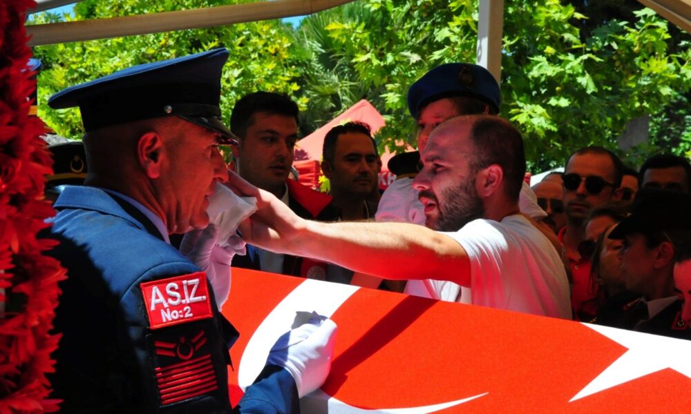 Şehidin kardeşi Nihat Mangura ise ağabeyi Mangura'nın tabutu başında bekleyen askerlerin terleyen yüzünü peçeteyle sildi.Fotoğraf:Manisa,(DHA)
