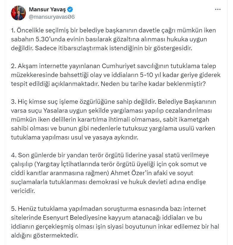 Başkan Yavaş, sosyal medya hesabından yaptığı açıklamada, “Öncelikle seçilmiş bir belediye başkanının davetle çağrı mümkün iken sabahın 05.30unda evinin basılarak gözaltına alınması hukuka uygun değildir. Sadece itibarsızlaştırmak istendiğinin bir göstergesidir. Akşam internette yayınlanan Cumhuriyet savcılığının tutuklama talep müzekkeresinde bahsettiği olay ve iddiaların 5-10 yıl kadar geriye giderek tespit edildiği açıklanmaktadır. Neden bu tarihe kadar beklenmiştir? Hiç kimse suç işleme özgürlüğüne sahip değildir. Belediye Başkanının varsa suçu yasalara uygun şekilde yargılaması yapılıp cezalandırılması mümkün iken delillerin karartılma ihtimali olmaması, sabit ikametgah sahibi olması ve bunun gibi nedenlerle tutuksuz yargılama usulü varken tutuklama yapılması usul ve yasaya aykırıdır. Son günlerde bir yandan terör örgütü liderine yasal statü verilmeye çalışılıp (Yargıtay içtihatlarında terör örgütü üyeliği için çok somut ve ciddi kanıtlar aranmasına rağmen) Ahmet Özer’in afaki ve soyut suçlamalarla tutuklanması demokrasi ve hukuk devleti adına endişe vericidir. Henüz tutuklama yapılmadan soruşturma esnasında bazı internet sitelerinde Esenyurt Belediyesine kayyum atanacağı iddiaları ve bu iddianın gerçekleşmiş olması, işin siyasi boyutunun inkar edilemez bir hal aldığını göstermektedir” ifadelerini kullandı.
