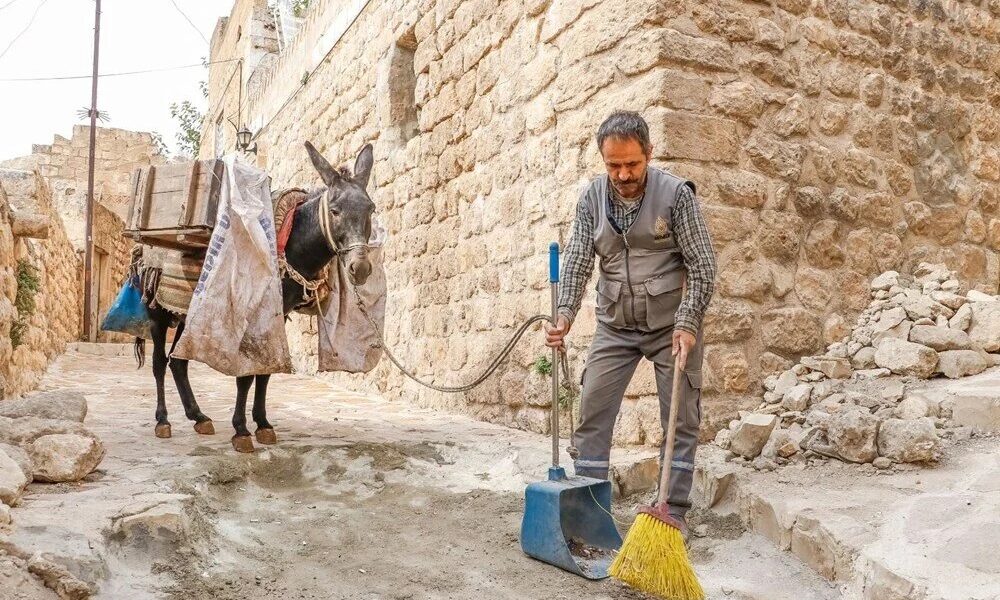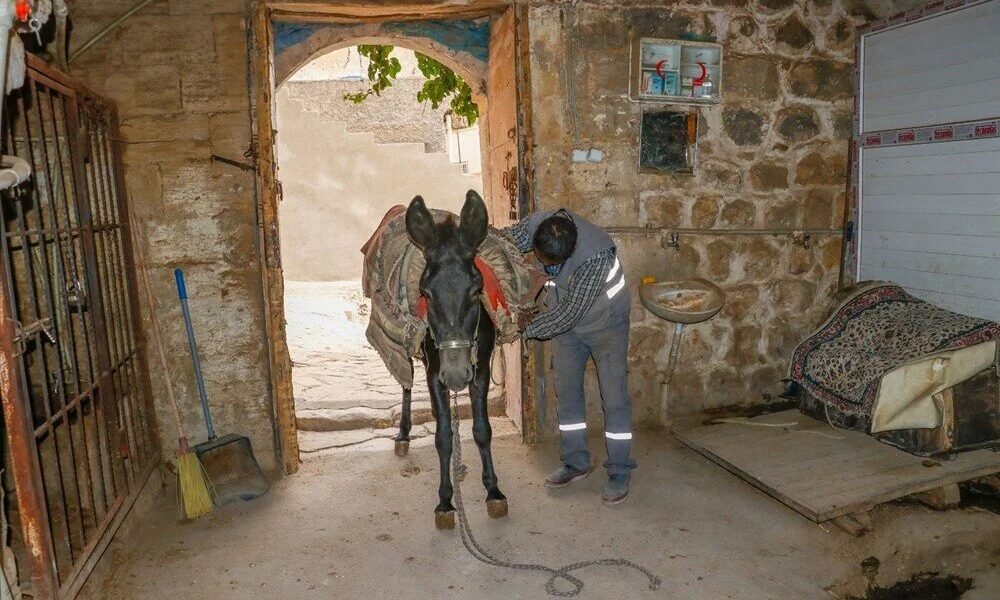 Güneydoğu Anadolu Bölgesinin en önemli turizm merkezlerinden biri olan Mardinin araç girmeyen dar ve merdivenli sokaklarındaki çöpler, yıllardır Artuklu Belediyesinin kadrolu eşekleriyle toplanıyor. Sabahın erken saatlerinde, başlarında 1 belediye personeli ile başlanan ve saat 10.00a kadar süren çöp toplama işlemi 5 saatlik dinlenme ve yemek molasının ardından saat 17.00ye kadar devam ediyor. İş bittikten sonra belediyenin kendileri için oluşturduğu tarihi alanda kalan eşekler, ortalama 7 yıl çalıştırıldıktan sonra emekli ediliyor. Emekliye ayrılan eşekler, hayatlarının geriye kalan kısmını yine belediyeye ait barınakta tamamlıyor.