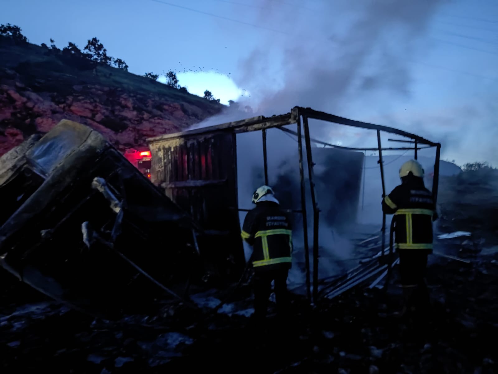 Kaza, gece saatlerinde Midyat- Nusaybin kara yolunda meydana geldi. Plakası öğrenilemeyen TIR, Beyazsu mevkinde henüz kimliği belirlenemeyen sürücüsünün kontrolünden çıkarak yol kenarına devrildi. Araç sürücüsü ve yanındaki 1 kişi yaralandı. Yaralılar kendi imkanlarıyla TIRdan çıkarken, araç bir süre sonra motor kısmından alev alarak yanmaya başladı. İhbar üzerine olay yerine sağlık, itfaiye ve jandarma ekipleri sevk edildi. Yaralılar, ilk müdahalenin ardından Nusaybin Devlet Hastanesi’ne kaldırılarak tedaviye alındı. Yaralıların sağlık durumunun iyi olduğu belirtilirken, yanan TIR da itfaiye ekiplerinin çalışmasıyla kontrol altına alınarak söndürüldü. TIR’ın kullanılamaz hale geldiği kazayla ilgili inceleme başlatıldı.