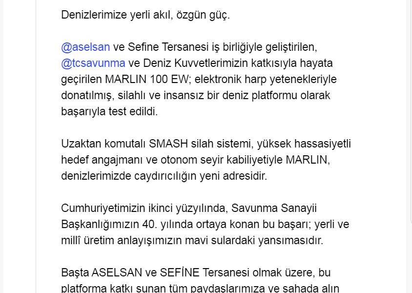 Haluk Görgün, NSosyal hesabından test faaliyetine ilişkin görüntüleri paylayarak, “Denizlerimize yerli akıl, özgün güç. ASELSAN ve Sefine Tersanesi iş birliğiyle geliştirilen, Milli Savunma Bakanlığımız ve Deniz Kuvvetlerimizin katkısıyla hayata geçirilen MARLIN 100 EW; elektronik harp yetenekleriyle donatılmış, silahlı ve insansız bir deniz platformu olarak başarıyla test edildi. Uzaktan komutalı SMASH silah sistemi, yüksek hassasiyetli hedef angajmanı ve otonom seyir kabiliyetiyle MARLIN, denizlerimizde caydırıcılığın yeni adresidir. Cumhuriyetimizin ikinci yüzyılında, Savunma Sanayii Başkanlığımızın 40ıncı yılında ortaya konan bu başarı; yerli ve milli üretim anlayışımızın mavi sulardaki yansımasıdır. Başta ASELSAN ve Sefine Tersanesi olmak üzere, bu platforma katkı sunan tüm paydaşlarımıza ve sahada alın teriyle bu sürece omuz veren çalışma arkadaşlarımıza gönülden teşekkür ediyorum. Yolumuz Mavi Vatan’dır. Gücümüz, kendi imkan ve kabiliyetlerimizdir” dedi.