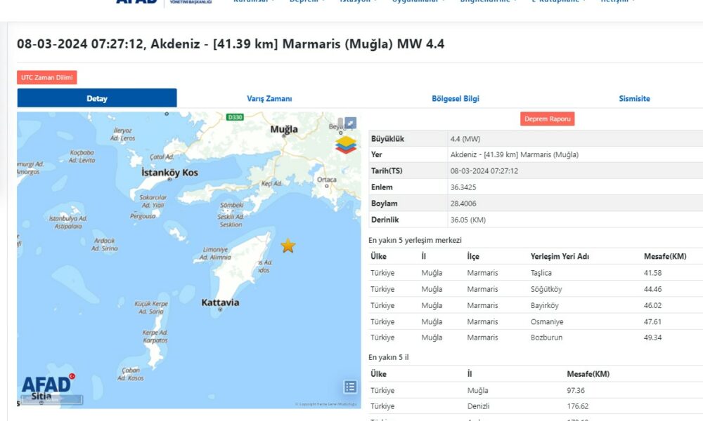 MUĞLAnın Marmaris ilçesi açıklarında 4.4 büyüklüğünde deprem meydana geldi.AFET ve Acil Durum Yönetimi Başkanlığının (AFAD), sosyal medya hesabından yaptığı paylaşımda, Richter ölçeğine göre Akdenizin Muğla Marmaris ilçesi açıklarında, saat 07.27de yerin 36.05 kilometre derinliğinde 4.4 büyüklüğünde bir deprem meydana geldiği bildirildi. Depremde ilk belirlemelere göre herhangi bir olumsuzluk yaşanmadı.