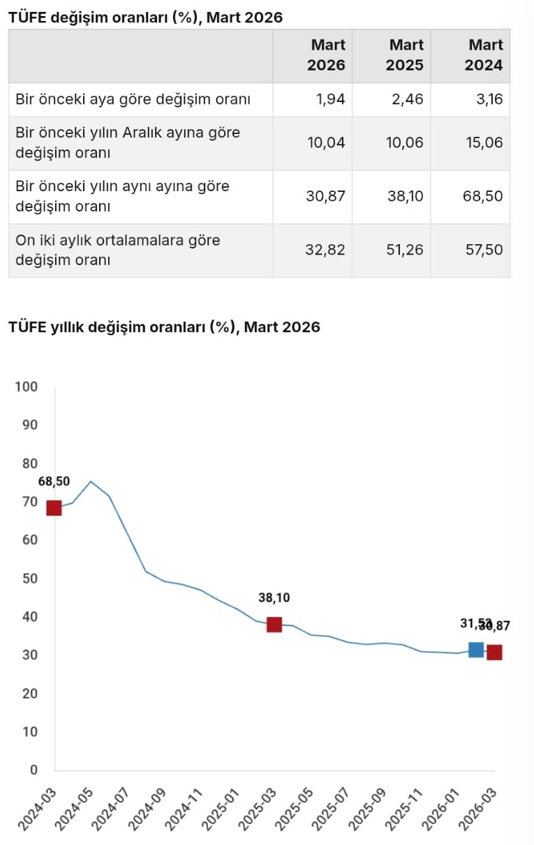 TÜİK, Mart 2026 dönemine ilişkin enflasyon verilerini açıkladı. Buna göre; tüketici fiyatları mart ayında bir önceki aya göre yüzde 1,94, bir önceki yılın aralık ayına göre yüzde 10,04, bir önceki yılın aynı ayına göre yüzde 30,87 ve 12 aylık ortalamalara göre yüzde 32,82 arttı.