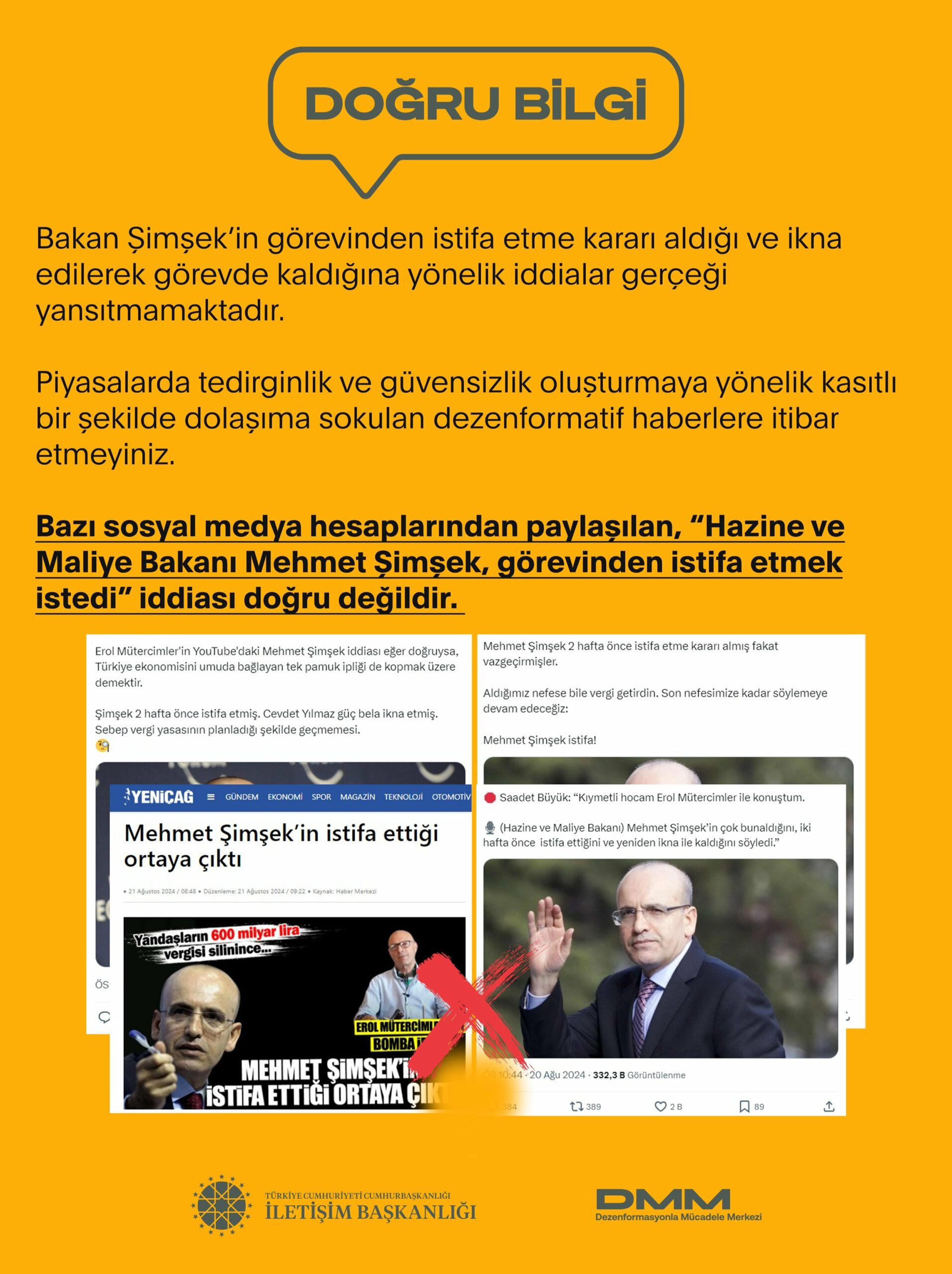 DMMnin sosyal medya hesabından yapılan açıklamada, “Bazı sosyal medya hesaplarından paylaşılan, Hazine ve Maliye Bakanı Mehmet Şimşek, görevinden istifa etmek istedi iddiası doğru değildir. Bakan Şimşekin görevinden istifa etme kararı aldığı ve ikna edilerek görevde kaldığına yönelik iddialar gerçeği yansıtmamaktadır. Piyasalarda tedirginlik ve güvensizlik oluşturmaya yönelik kasıtlı bir şekilde dolaşıma sokulan dezenformatif haberlere itibar etmeyiniz” denildi.