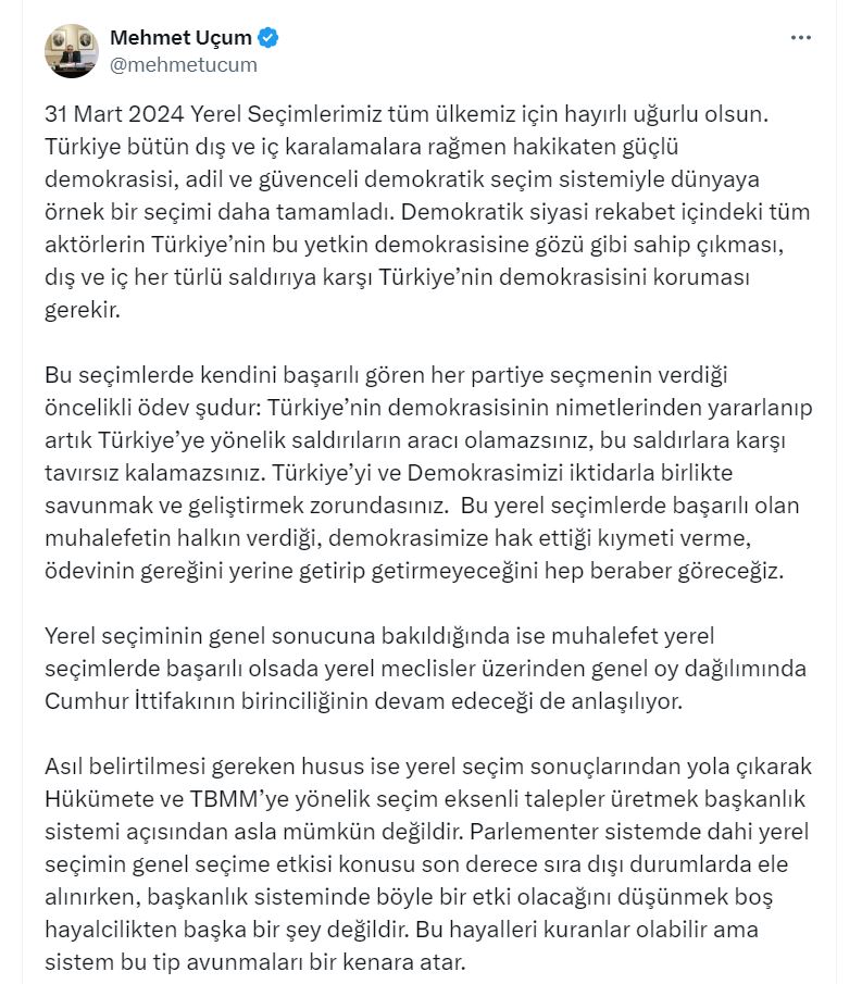 CUMHURBAŞKANI Başdanışmanı ve Cumhurbaşkanlığı Hukuk Politikaları Kurulu Başkanvekili Mehmet Uçum, “Partilerin yerel meclisler üzerinden aldıkları oy oranları üzerinden genel seçimlere yönelik hesap yapanlar bence boşa uğraşmasınlar. Türkiye 2028e kadar dört yıllık seçimsiz dönemde her alanda reform siyasetini hayata geçirecektir” dedi.Mehmet Uçum, sosyal medya hesabından yaptığı açıklamada, “31 Mart 2024 yerel seçimlerimiz tüm ülkemiz için hayırlı uğurlu olsun. Türkiye, bütün dış ve iç karalamalara rağmen hakikaten güçlü demokrasisi, adil ve güvenceli demokratik seçim sistemiyle dünyaya örnek bir seçimi daha tamamladı. Demokratik siyasi rekabet içindeki tüm aktörlerin Türkiye’nin bu yetkin demokrasisine gözü gibi sahip çıkması, dış ve iç her türlü saldırıya karşı Türkiyenin demokrasisini koruması gerekir. Bu seçimlerde kendini başarılı gören her partiye seçmenin verdiği öncelikli ödev şudur; Türkiyenin demokrasisinin nimetlerinden yararlanıp artık Türkiyeye yönelik saldırıların aracı olamazsınız, bu saldırılara karşı tavırsız kalamazsınız. Türkiyeyi ve demokrasimizi iktidarla birlikte savunmak ve geliştirmek zorundasınız. Bu yerel seçimlerde başarılı olan muhalefetin halkın verdiği, demokrasimize hak ettiği kıymeti verme, ödevinin gereğini yerine getirip getirmeyeceğini hep beraber göreceğiz. Yerel seçiminin genel sonucuna bakıldığında ise muhalefet yerel seçimlerde başarılı olsa da yerel meclisler üzerinden genel oy dağılımında Cumhur İttifakının birinciliğinin devam edeceği de anlaşılıyor” dedi.SİSTEM BU TİP AVUNMALARI BİR KENARA ATARUçum, açıklamasının devamında, “Asıl belirtilmesi gereken husus ise yerel seçim sonuçlarından yola çıkarak hükümete ve TBMMye yönelik seçim eksenli talepler üretmek başkanlık sistemi açısından asla mümkün değildir. Parlamenter sistemde dahi yerel seçimin genel seçime etkisi konusu son derece sıra dışı durumlarda ele alınırken, başkanlık sisteminde böyle bir etki olacağını düşünmek boş hayalcilikten başka bir şey değildir. Bu hayalleri kuranlar olabilir ama sistem bu tip avunmaları bir kenara atar. Partilerin yerel meclisler üzerinden aldıkları oy oranları üzerinden genel seçimlere yönelik hesap yapanlar bence boşa uğraşmasınlar. Türkiye 2028e kadar dört yıllık seçimsiz dönemde her alanda reform siyasetini hayata geçirecektir. Cumhurbaşkanı Erdoğan, ülke liderliğiyle bağımsız ve güçlü Türkiye perspektifine bağlı olarak Türkiyenin yeni aşamalara geçmesine önderlik yapacaktır. Kimsenin şüphesi olmasın” ifadelerini kullandı.
