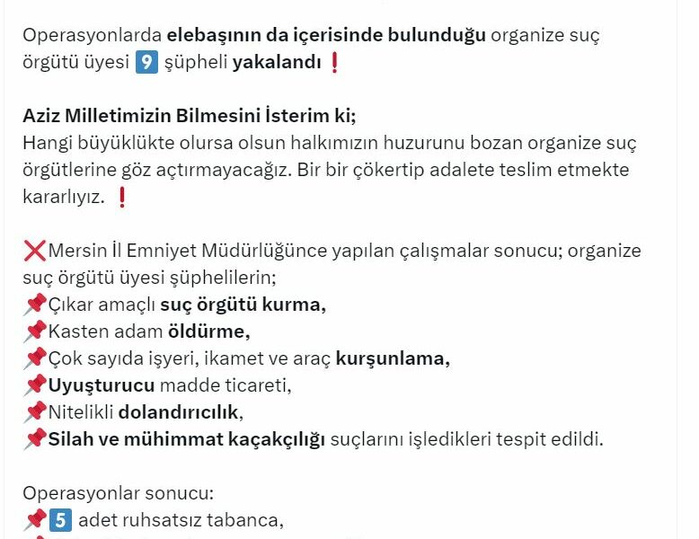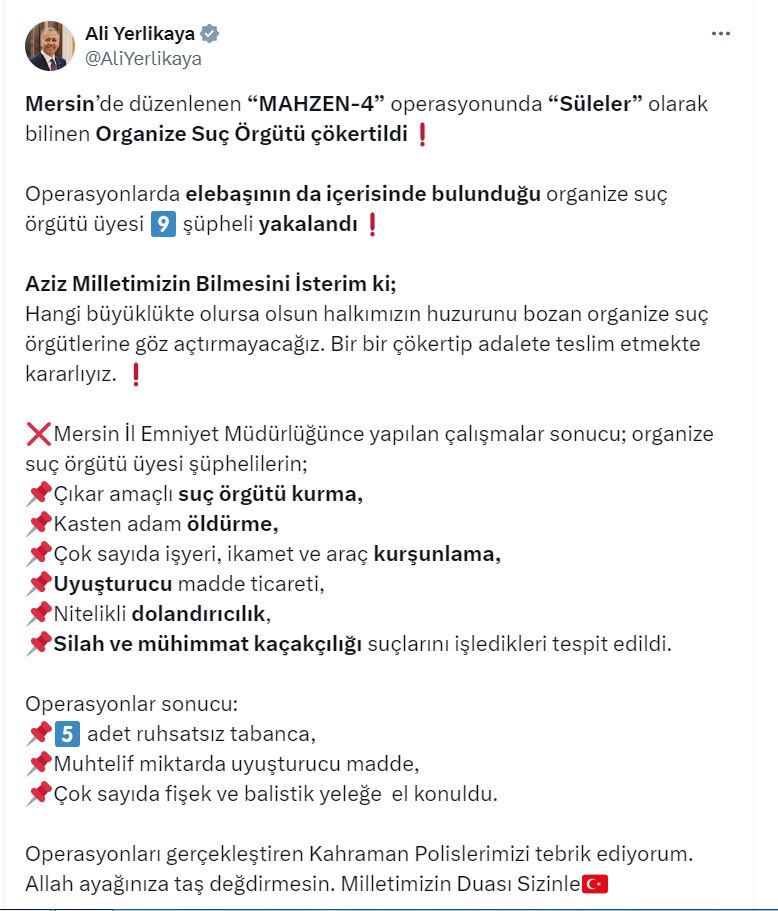 İÇİŞLERİ Bakanı Ali Yerlikaya, Mersinde düzenlenen Mahzen-4 operasyonunda, Süleler olarak bilinen organize suç örgütünün çökertildiğini ve 9 şüphelinin yakalandığını duyurdu.Bakan Yerlikaya, sosyal medya hesabından yaptığı açıklamada, “Mersinde düzenlenen Mahzen-4 operasyonunda Süleler olarak bilinen organize suç örgütü çökertildi. Operasyonlarda elebaşının da içerisinde bulunduğu organize suç örgütü üyesi 9 şüpheli yakalandı. Operasyonlar sonucu 5 adet ruhsatsız tabanca, muhtelif miktarda uyuşturucu madde, çok sayıda fişek ve balistik yeleğe el konuldu. Operasyonları gerçekleştiren kahraman polislerimizi tebrik ediyorum. Allah ayağınıza taş değdirmesin. Milletimizin duası sizinle. Aziz milletimizin bilmesini isterim ki hangi büyüklükte olursa olsun halkımızın huzurunu bozan organize suç örgütlerine göz açtırmayacağız. Bir bir çökertip adalete teslim etmekte kararlıyız” dedi.