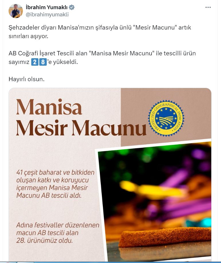 Bakan Yumaklı, sosyal medya hesabından yaptığı açıklamada, katkı maddesi ve koruyucu içermeyen, 41 çeşit baharat ve bitkiden oluşan mesir macununun ABden tescil aldığını belirterek, “Şehzadeler diyarı Manisamızın şifasıyla ünlü mesir macunu artık sınırları aşıyor. AB Coğrafi İşaret Tescili alan Manisa mesir macunu ile tescilli ürün sayımız 28e yükseldi. Hayırlı olsun” dedi.