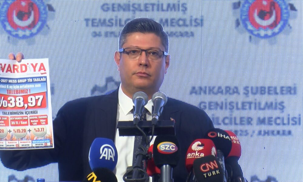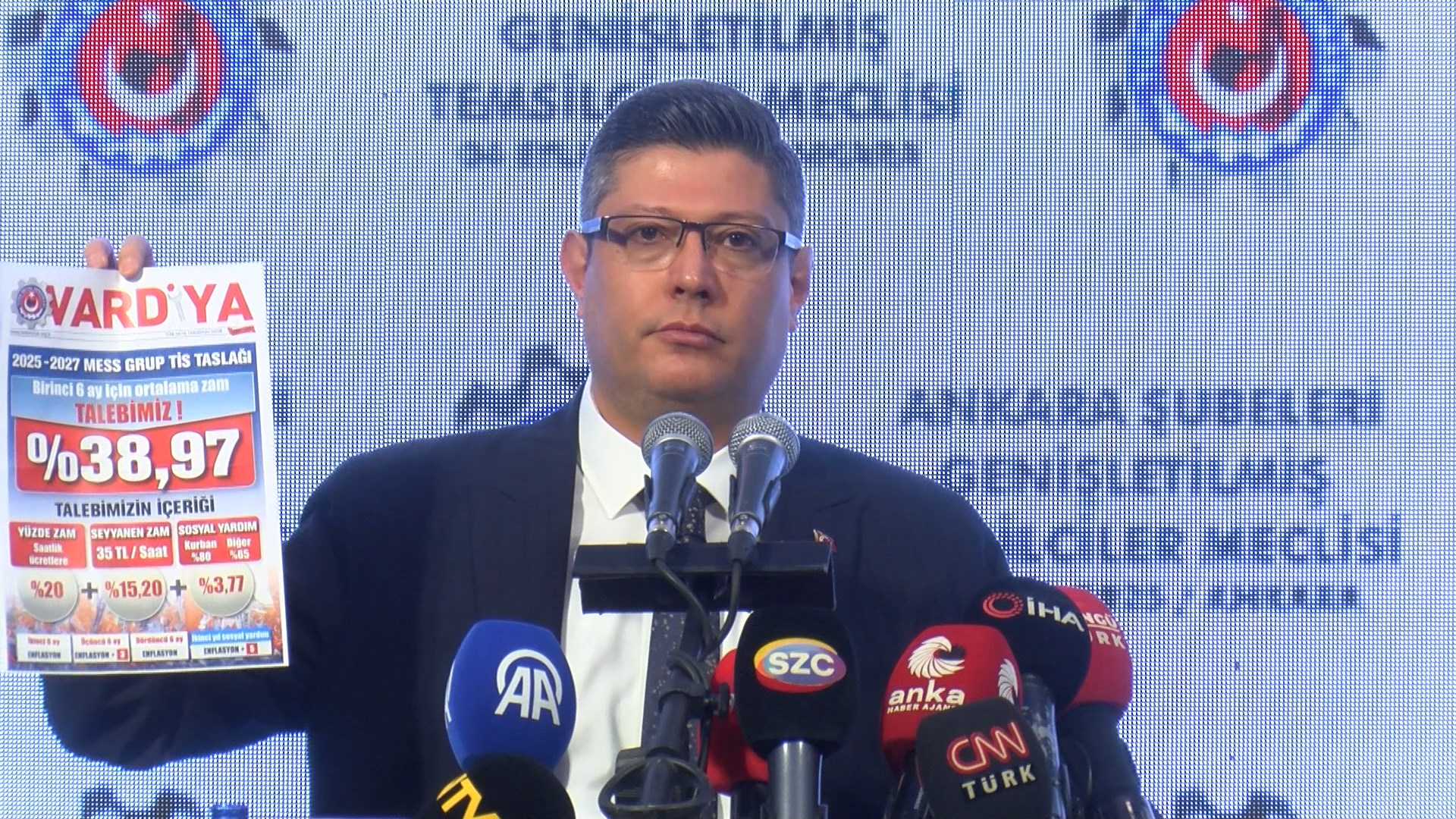 Altundağ, “2025- 2027 yılları arasında iki yıllık olacak şekilde teklif ettiğimiz Türk Metal-MESS Grup Toplu İş Sözleşmesi taslağımızda ilk 6 ay için zam talebimiz yüzdelik zam artı seyyanen zam formülünden oluşuyor. Sözleşme kapsamındaki üyelerimizin 31 Ağustos 2025 tarihindeki saat ücretlerine 1 Eylül 2025ten geçerli olmak üzere ilk 6 ay için önce 20 zam talep ediyoruz. Bu zammın uygulanmasının ardından yine tüm üyelerimizin saat ücretlerine ilk 6 ay için seyyanen 35 lira daha zam talep ediyoruz. Böylece istediğimiz bu iki zammın sonucu olarak MESS Grup Toplu İş Sözleşmesi kapsamındaki üyelerimizin saat ücretlerine ilk 6 ay için ortalama yüzde 35,2 zam talep etmiş oluyoruz” dedi.
